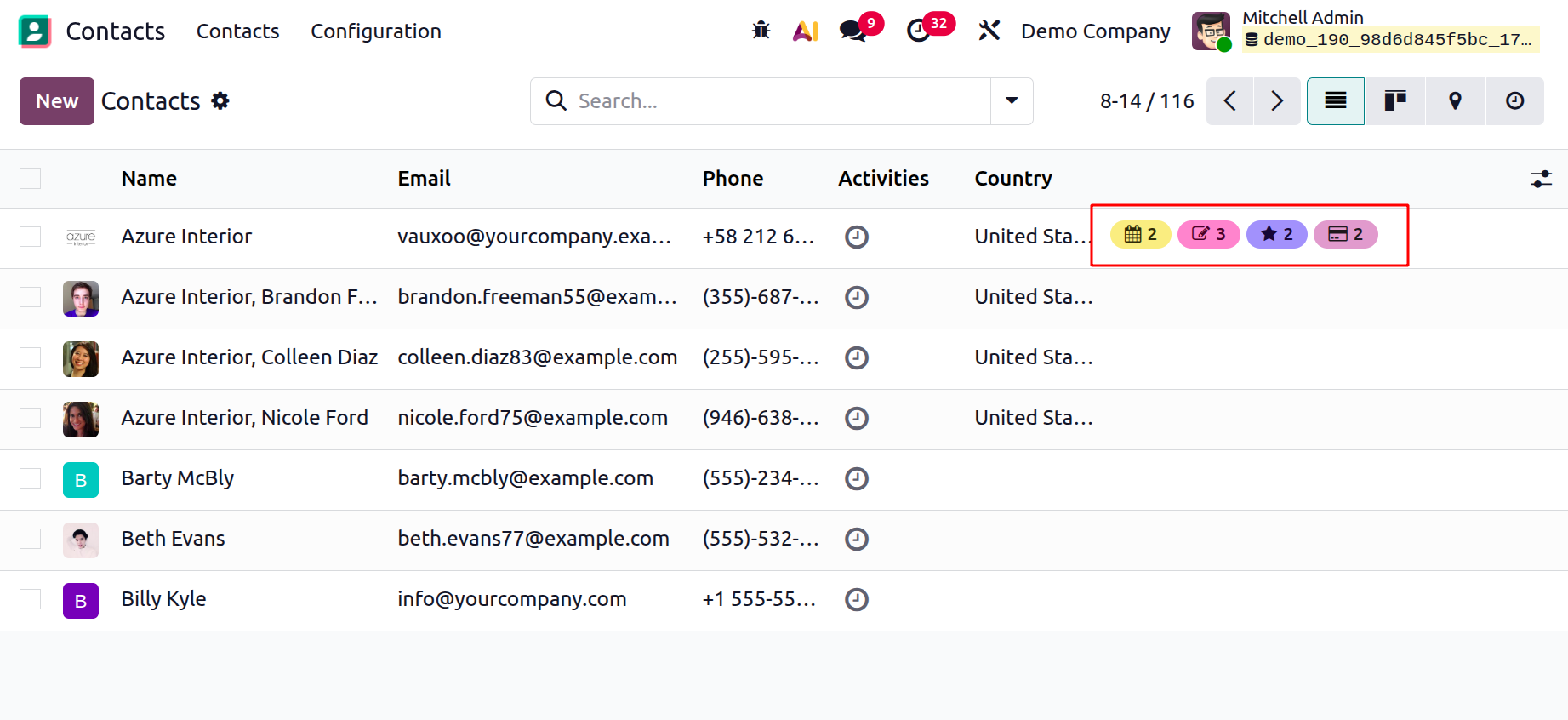 In Odoo 19, the Contacts list view introduces new activity indicators displayed as colored icons beside each contact. These icons provide a quick overview of related records without needing to open the contact profile. For example, the calendar icon displays the number of scheduled meetings, the note icon represents invoices, bills, and mandates, the star icon indicates linked opportunities, and the card icon highlights purchases. This enhancement enhances cross-app visibility, allowing users to instantly assess engagement levels with each contact directly from the dashboard.