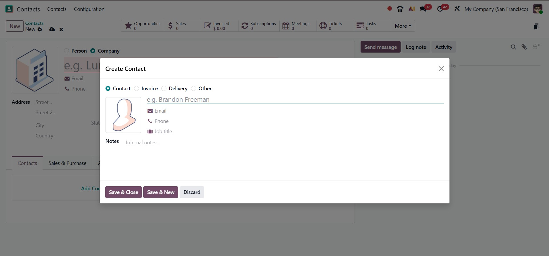 Now, let us configure each address type separately. To begin, you can create a Contact Address by selecting the Contact option from the pop-up window. This feature makes it easy to organize the details of employees or representatives associated with an organization. Once the Contact option is chosen, a new form will appear. In this form, you can enter the Contact Name in the provided field, as shown in the screenshot below. Additional information, such as job title, phone number, email address, and other relevant details, can also be included. And then go to the menu and choose "Save & Close".