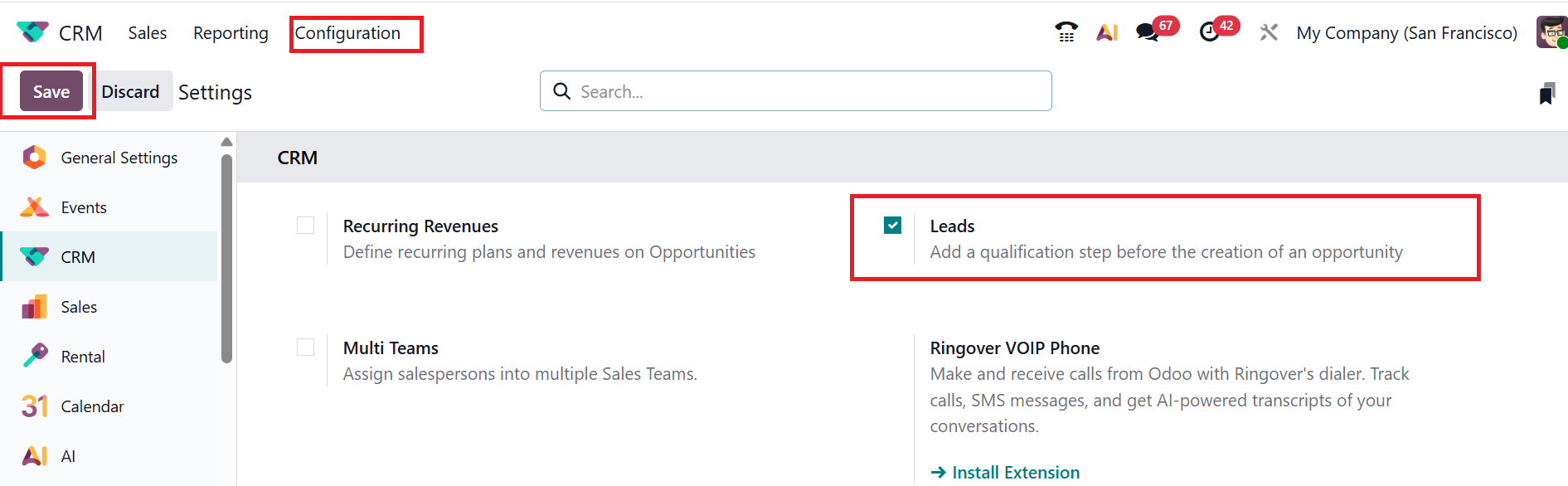 To enable the Lead option, navigate to Configuration > Settings. Then, enable Leads under the CRM section and click on the Save button to save the changes as shown below: