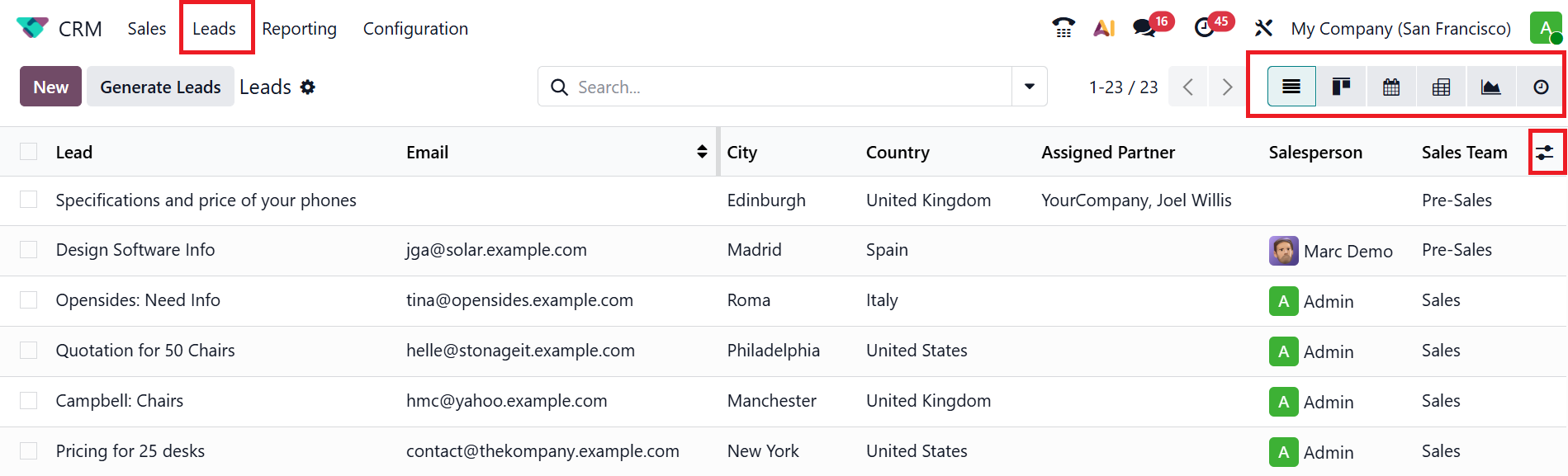 When you enable the Leads option, a new menu named Leads will appear in the menu bar, as shown below. By default, you can see the lead dashboard in List view. You can also customize the dashboard view to be Kanban, Calendar, Pivot, Graph, or Activity.