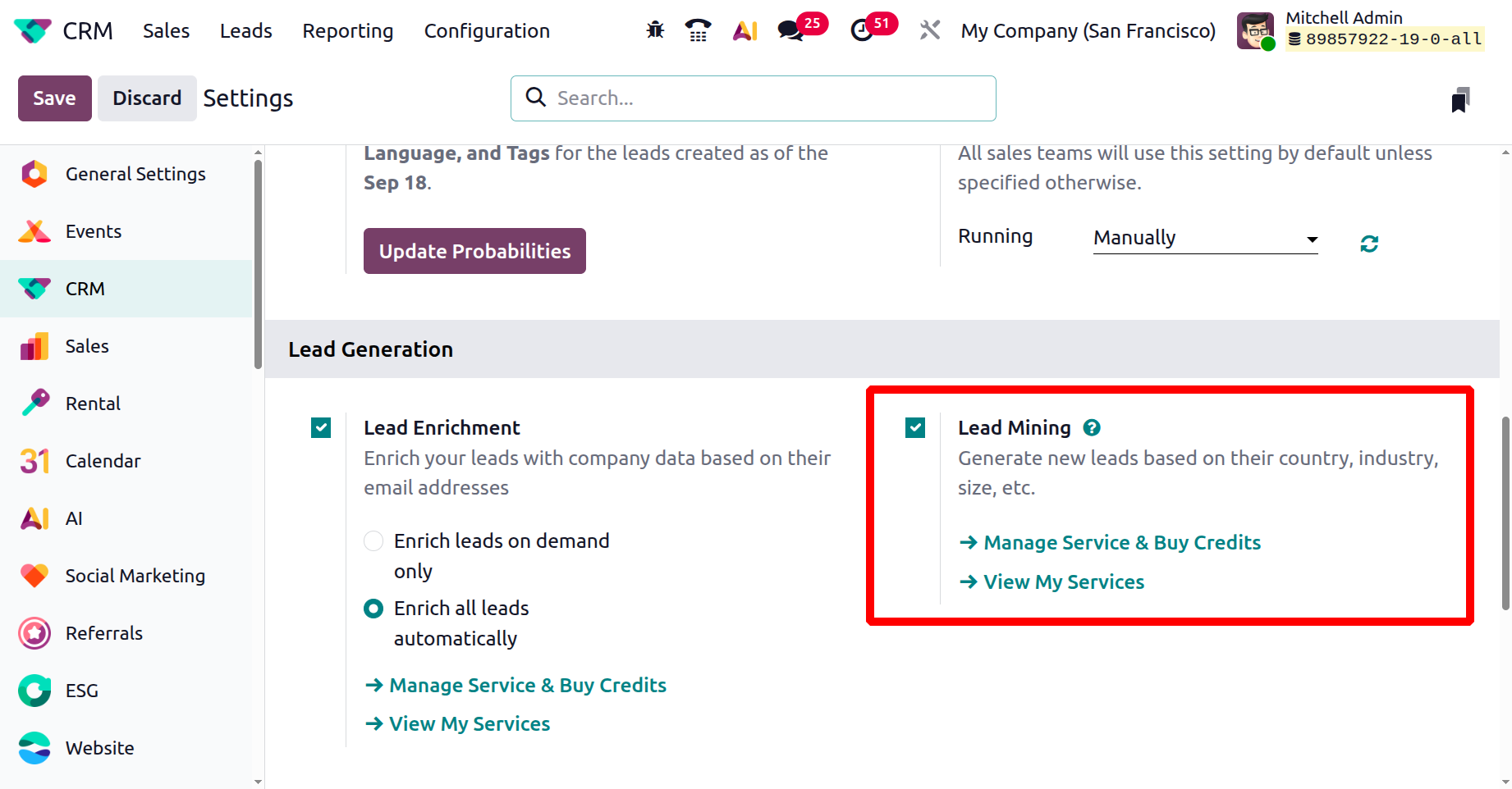 You can automatically generate leads based on the parameters by clicking on the Generate Leads button. For that, you need to enable the Lead Mining option from the Settings to get the Generate Leads button. Navigate to Configuration > Settings and enable the Lead Mining option under the Lead Generation section.