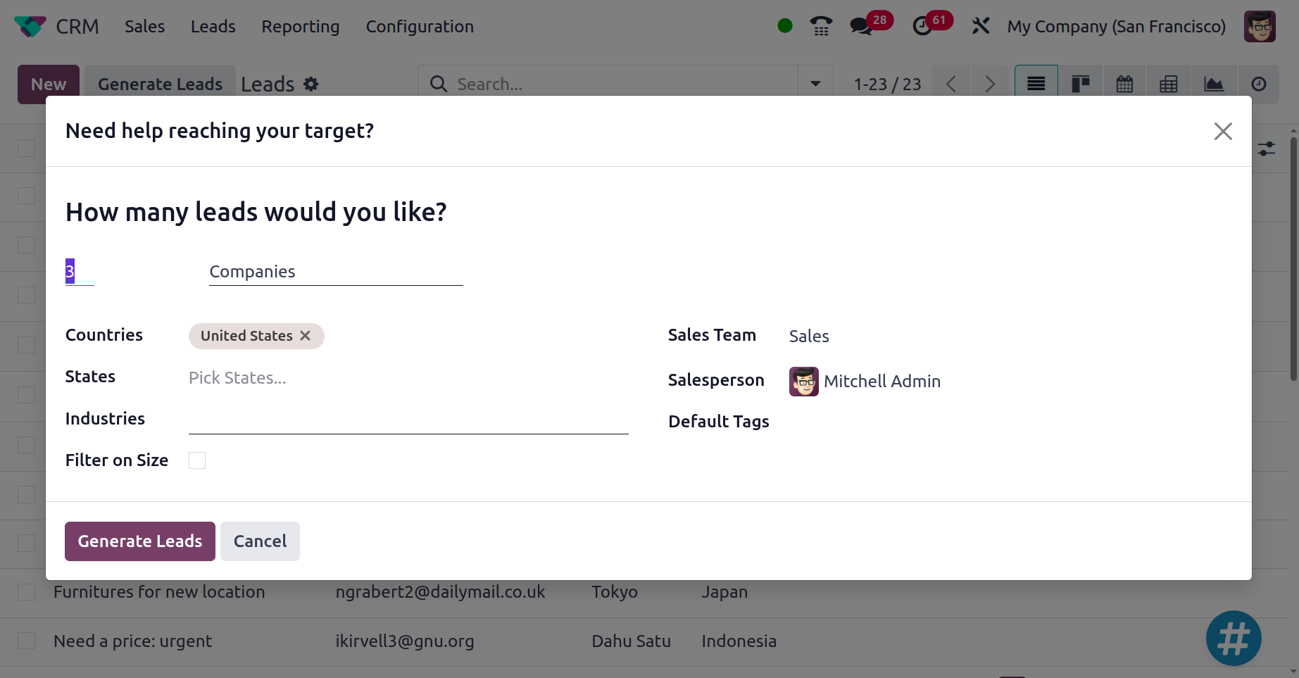 To automatically generate leads in lead management, click the Generate Leads button. A pop-up window will open, where you can enter the number of leads you want to generate, as shown in the image below. Then, select the target as Companies or Companies and their Contacts. You can provide details such as Countries, States, and Industries. To filter leads by size, enable the Filter on Size option. Next, to manage the leads, choose a Sales Team and assign a Salesperson. You can also add appropriate tags in the Default Tags field. Finally, click the Generate Leads button.