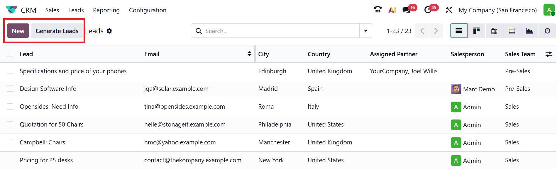 A lead in Odoo 19 CRM is the initial phase of a customer’s desire before it develops into a qualified sales opportunity. It gets sources from emails, marketing campaigns, internet forms, or manual data entry by the sales team. Leads assist companies in gathering unfiltered queries and preserving crucial information, such as contact data, details, and the source of interest. To determine whether to turn these leads into possibilities for additional follow-up, sales teams might evaluate and qualify them. This procedure prevents prospective clients from leaving and ensures a more organized sales management process.