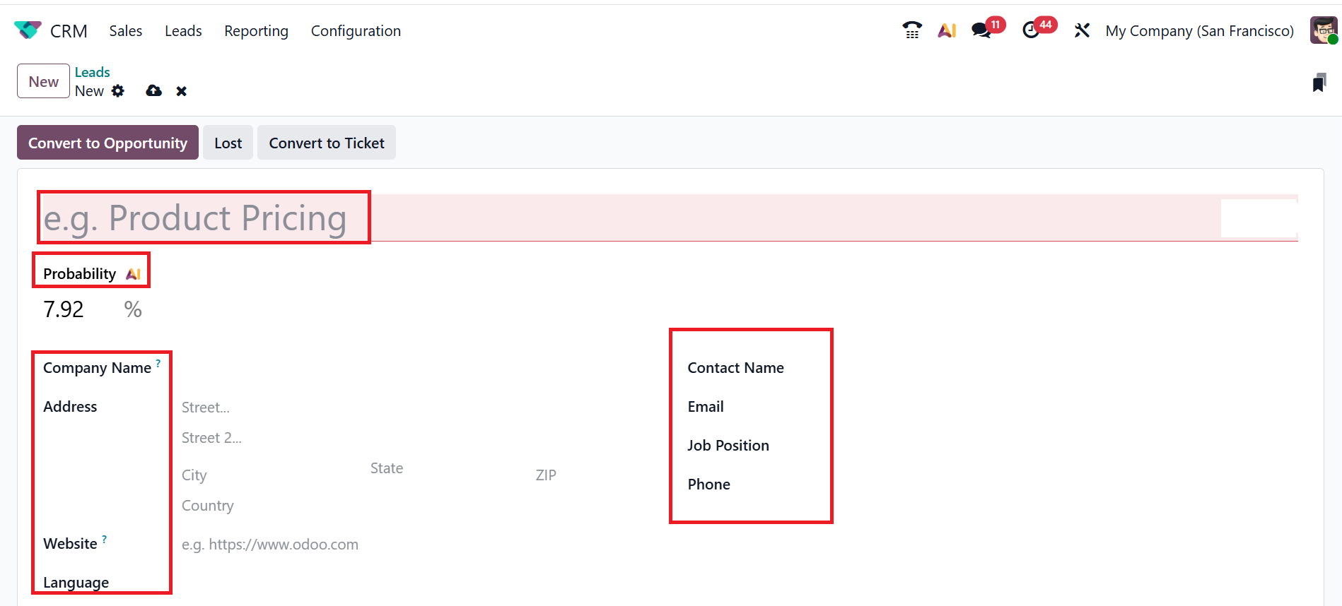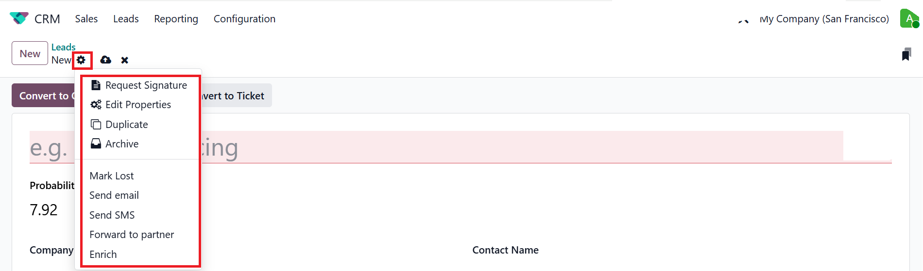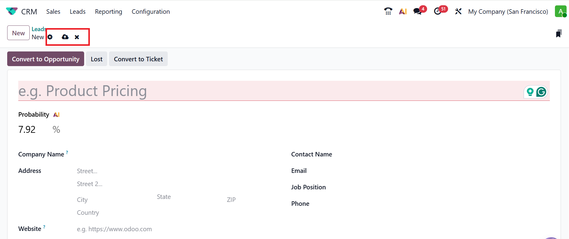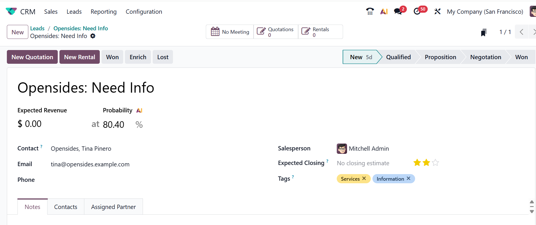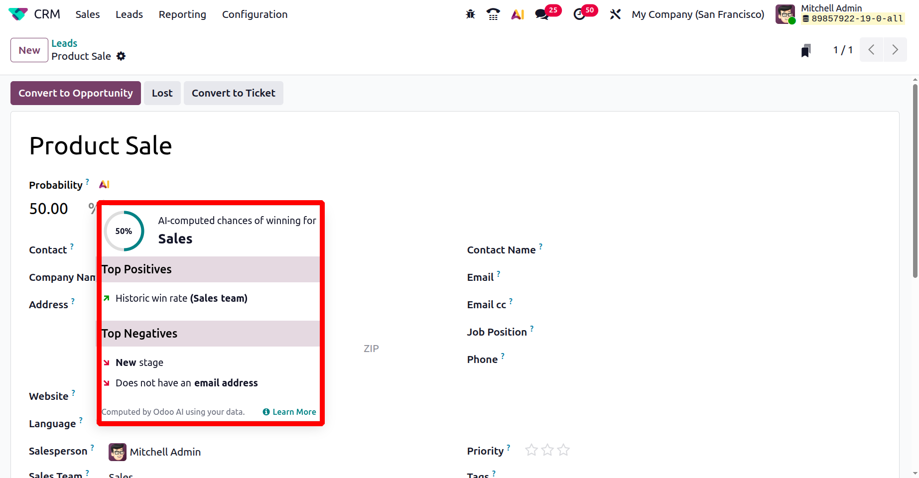 Here, add an appropriate name for your newly created lead. The Probability AI represents the chance of successfully closing a lead or opportunity by using AI (artificial intelligence). Advanced Win-Rate Analysis is a new feature in the Odoo 19 CRM module. Here is a detailed analysis of lead performance and conversion rates.