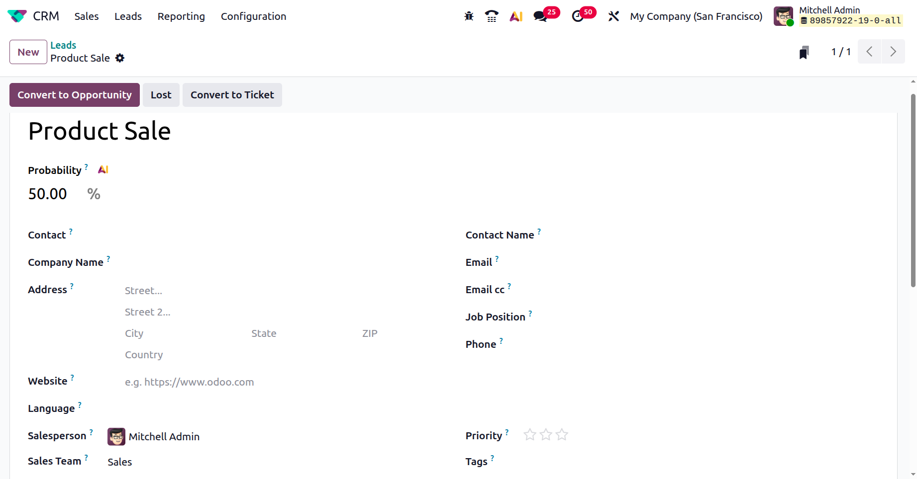 Select a team to manage the lead in the Sales Team field. Then, choose an employee to lead the management in the Salesperson field. Mark the stars based on the lead’s priority in the Priority field. In the Tags field, add appropriate tags to classify and analyze the lead.