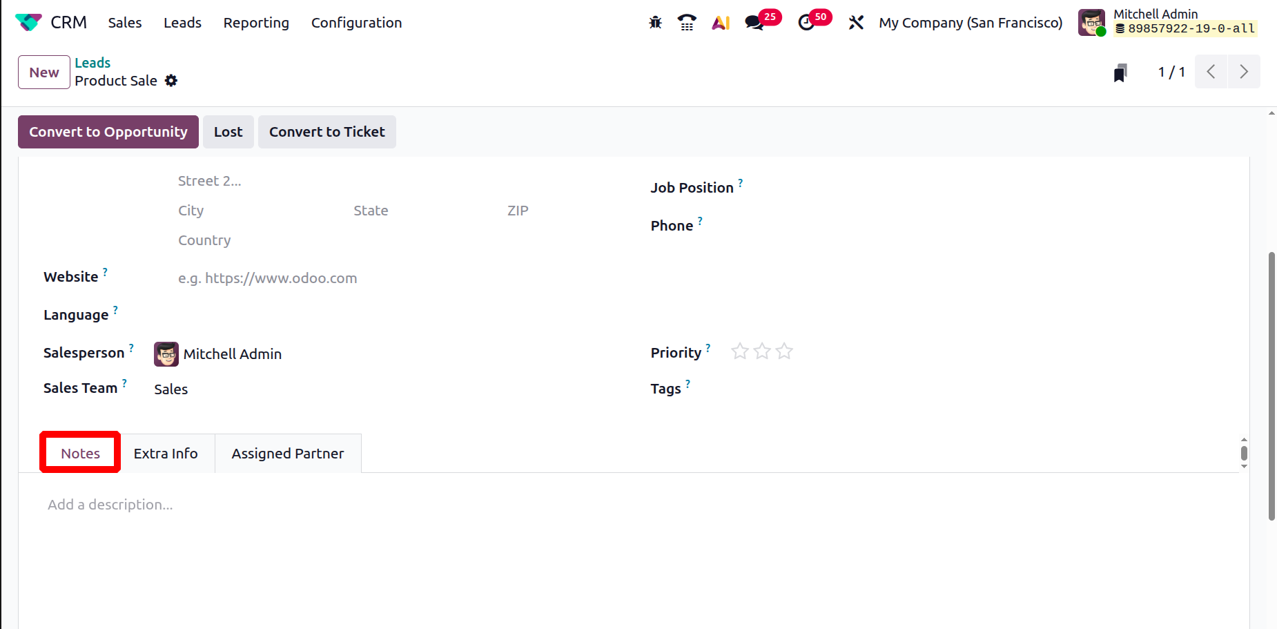 Here, you can see three tabs: Notes, Extra Info, and Assigned Partners. Under the Notes tab, add a description about the lead.