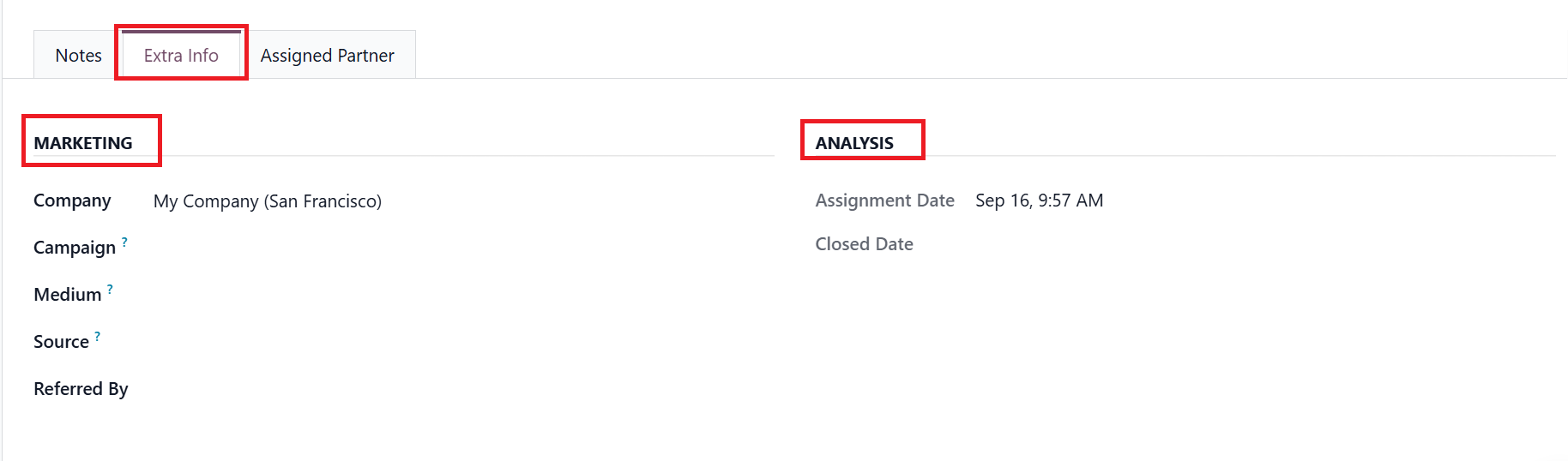 Under the Extra Info tab, there are two sections: Marketing and Analysis. Within the Marketing section, the Company field allows you to select a company. In the Campaign field, select a campaign effort from the list. In the Medium field, select a method of delivery for the lead from the list. Select a source link from the list in the Source field. You can also add a person who referred to the lead in the Referred By field. Under the Analysis section, the Assignment Date will be automatically filled. Next, enter the lead’s Closed Date.