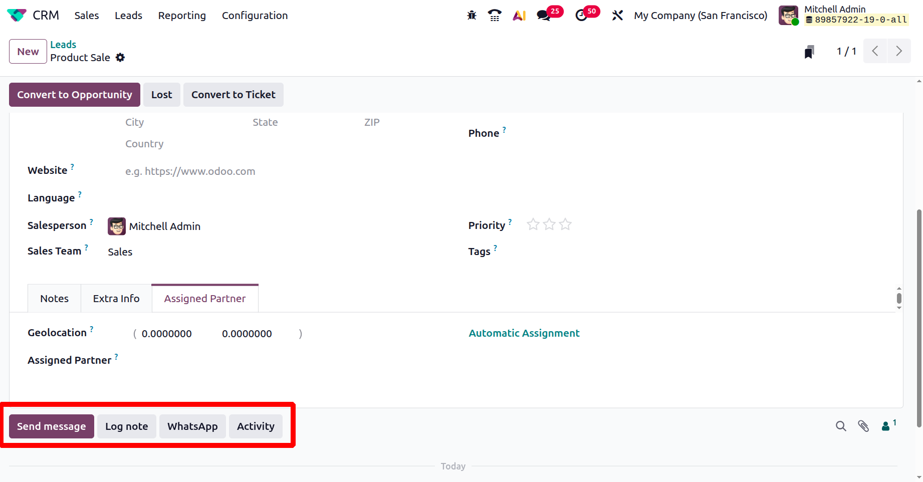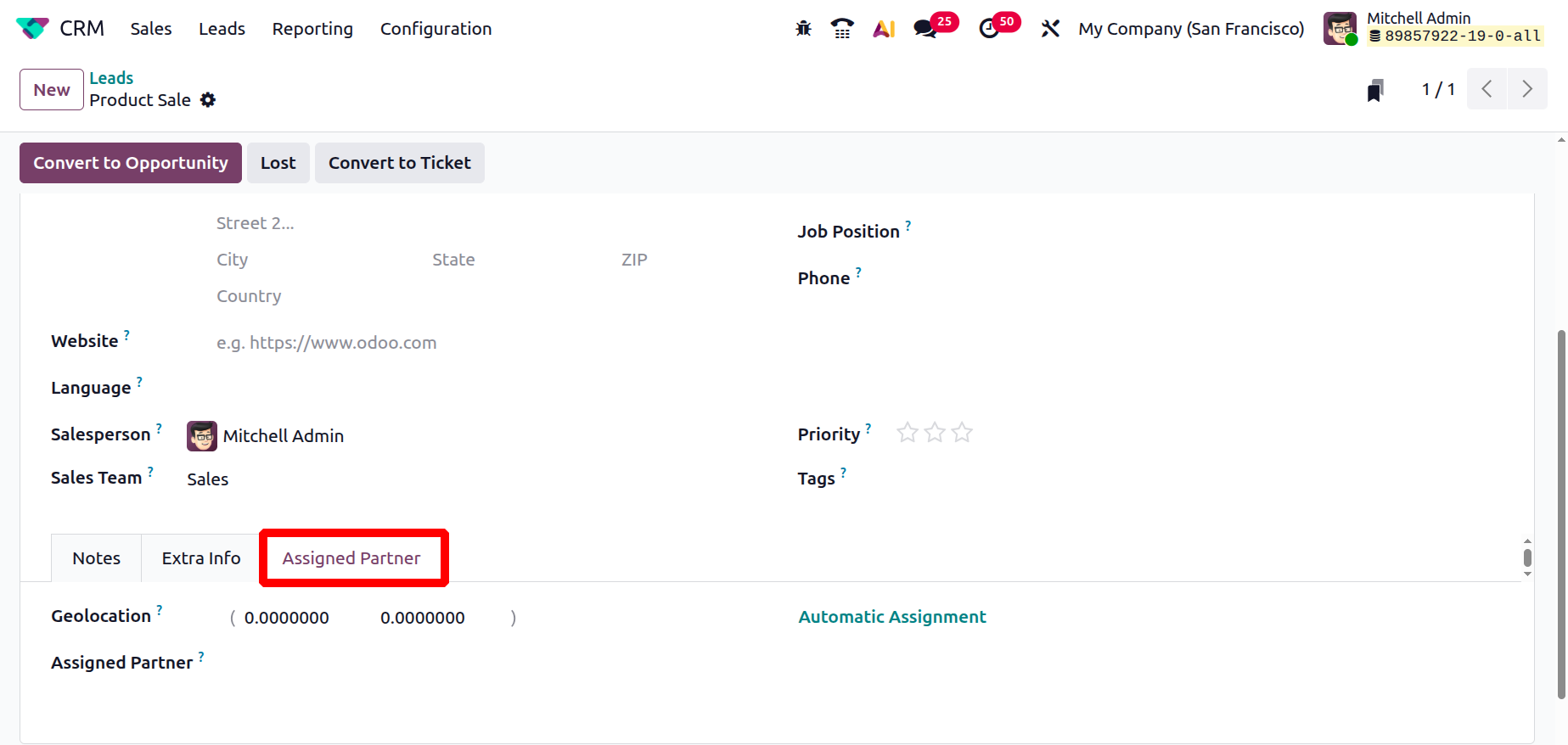 Under the Assigned Partner section, add the lead's location in the Geolocation field. You can also add a partner in the Assigned Partner field.
