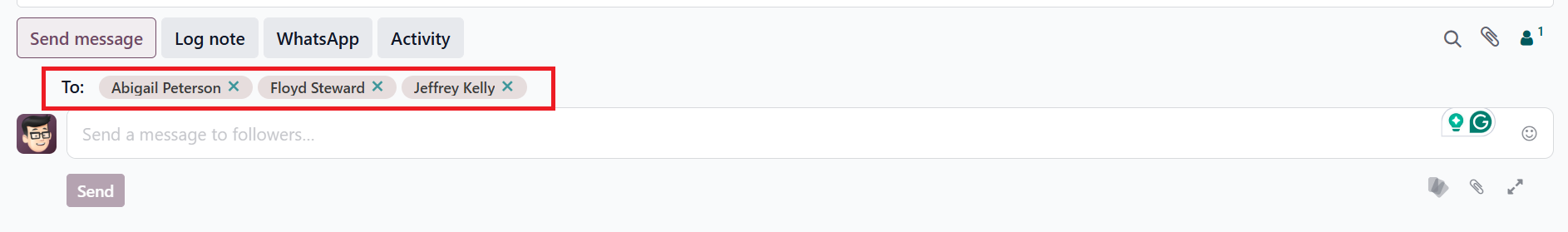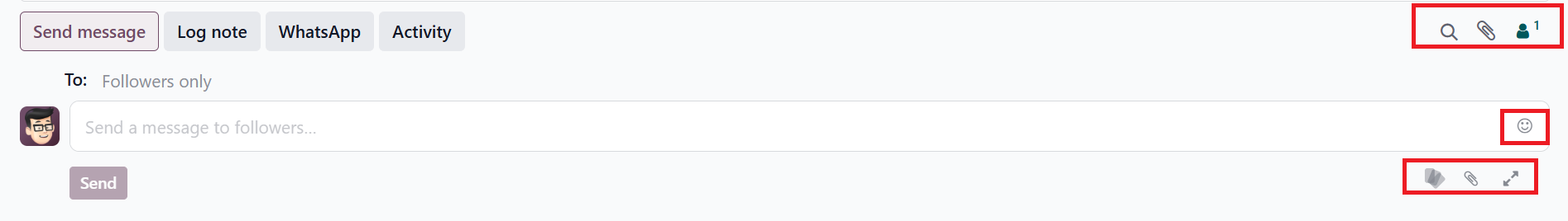 At the bottom of the window, you can see four options: Send message, Log note, WhatsApp, and Activity. Click the Send message button, and a new section will appear.