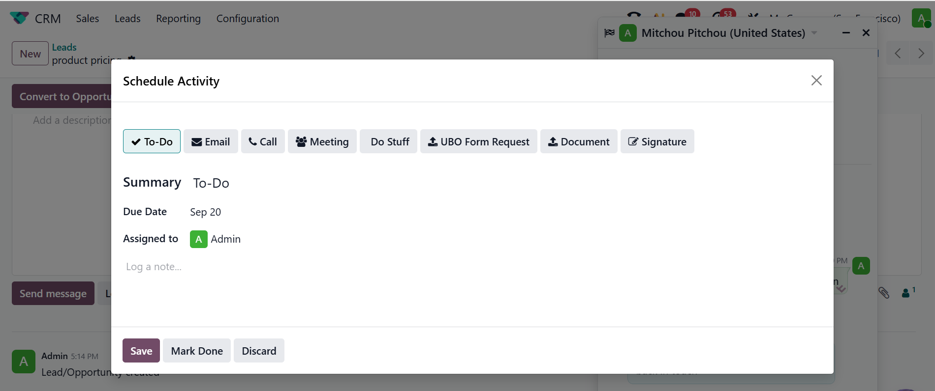 When you click the Activity button, a pop-up window will appear, as shown in the image below. This option is the same as the Schedule Activity option, which is explained above.