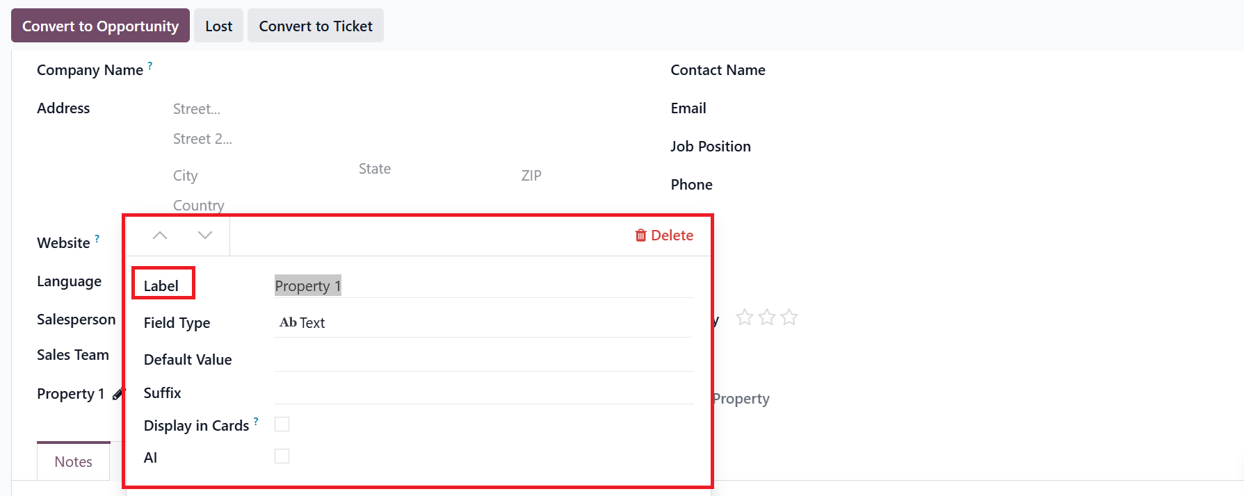You can also enable AI support by activating the AI option for the field. When you allow the AI option, a new option called Prompt will appear. In the Prompt option, you can add an AI instruction to generate the value. Additionally, you can access three options: Convert to Opportunity, Lost, and Convert to Ticket, which will be detailed in the following sections.