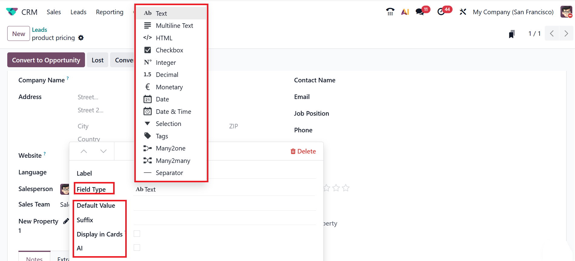 Choose a new field type from the drop-down menu in the Field Type field. The field type includes Text, Multiline Text, HTML, Checkbox, Integer, Decimal, Monetary, Date, Date & Time, Selection, Tags, Many2one, Many2many, or Separator. Add a value for the field in the Default Value field. In the Suffix field, you can enter a text or unit that appears next to the field value. Enable the Display in Cards option to show fields in Calendar, Cards, or Kanban views.