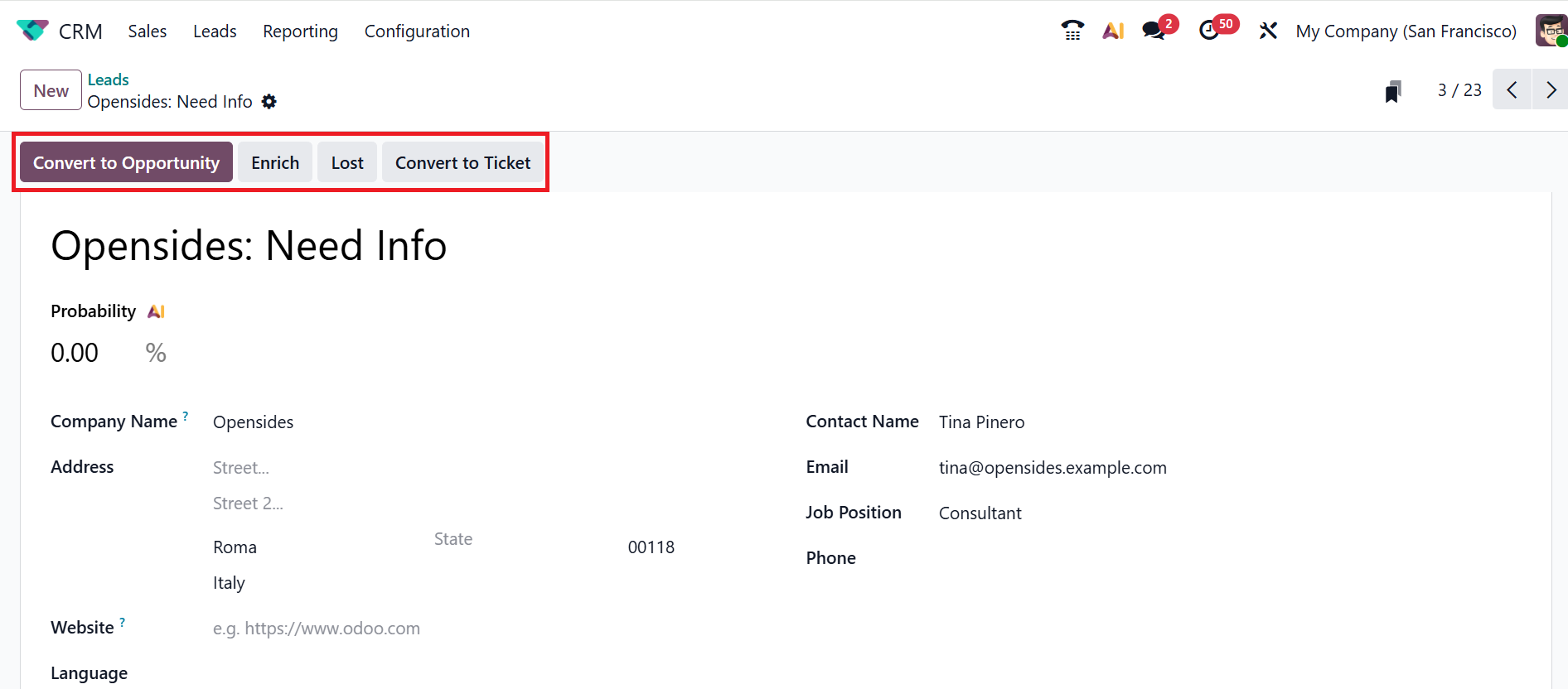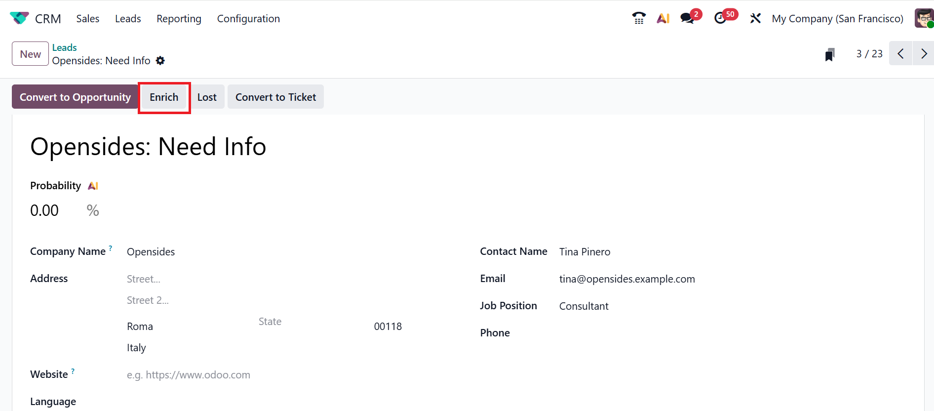 Select an already generated lead from the list, as shown below. This section offers options, including Convert to Opportunity, Enrich, Lost, and Convert to Ticket.