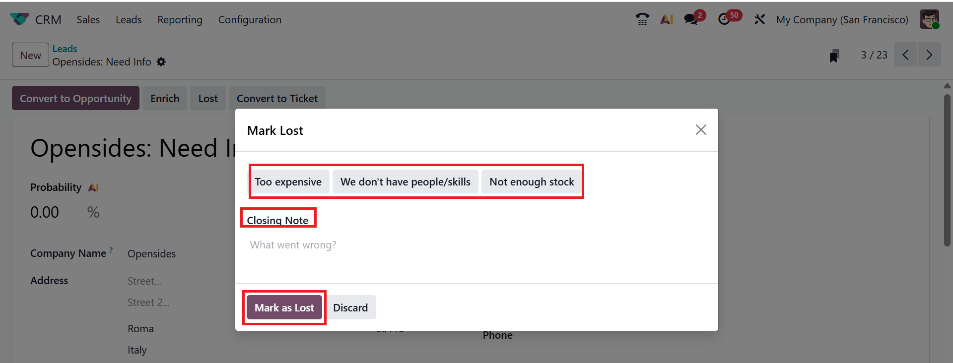 To indicate that the lead is lost, click on the Lost button. A new pop-up screen will appear, where you can select a pre-configured Lost Reason from the list arranged in a new pattern, which is a new pattern arrangement in Odoo 19. Under the Closing Note option, add a note about the lost reason and then click on the Mark as Lost button, as shown below: