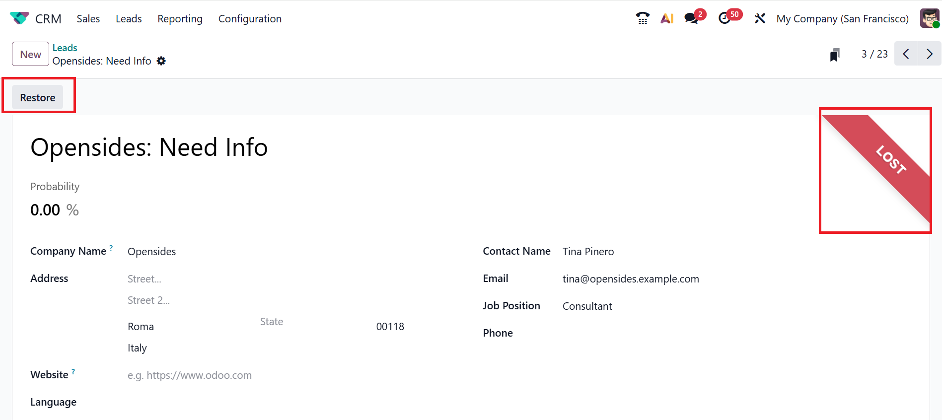 Here, you can see the lead is in the Lost stage. Press the Restore button to go back to the earlier lead stage.