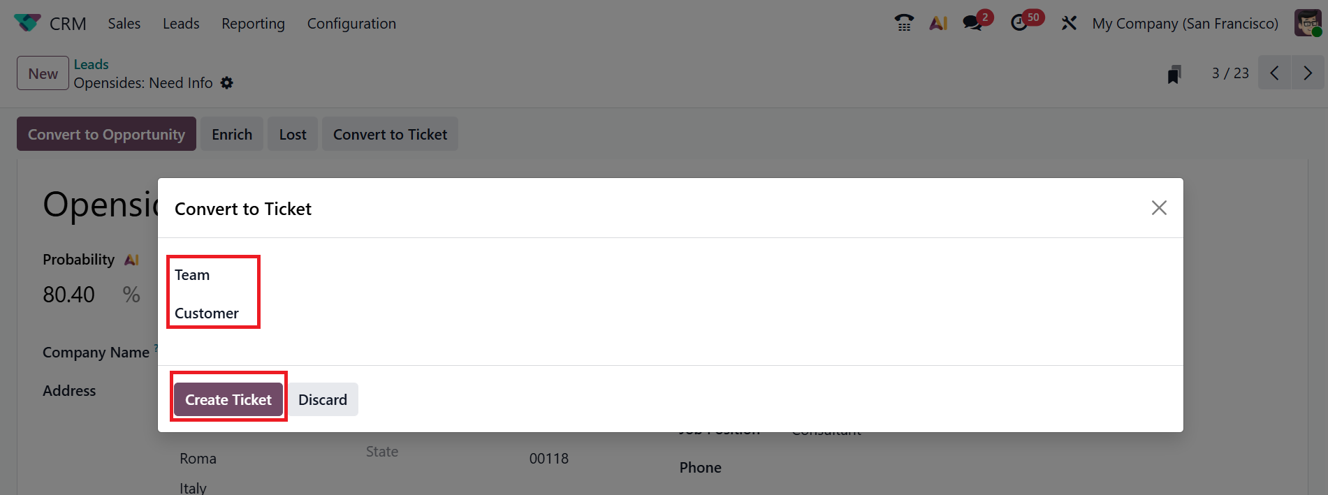 Click the Convert to Ticket button to transform the lead into a ticket. Next, a pop-up window will appear, as illustrated below. Then, choose a Team and Customer and click on the Create Ticket button as shown below.