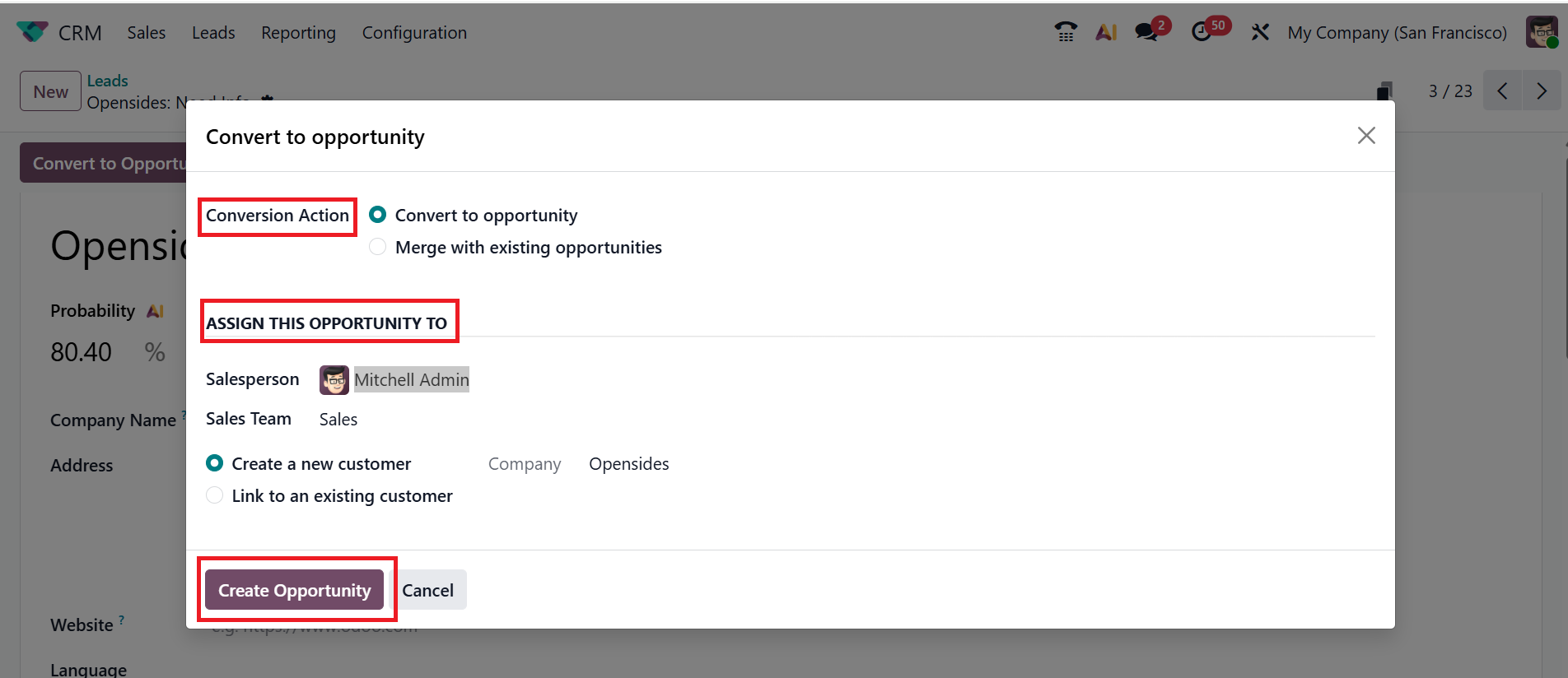 From the Conversion Action field, pick either Convert to Opportunity or Merge with Existing Opportunities. Then, under the Assign This Opportunity To section, choose a Sales Team and Salesperson. Then, select whether to create a new customer record or link to an existing one. After that, click the Create Opportunity button shown below.
