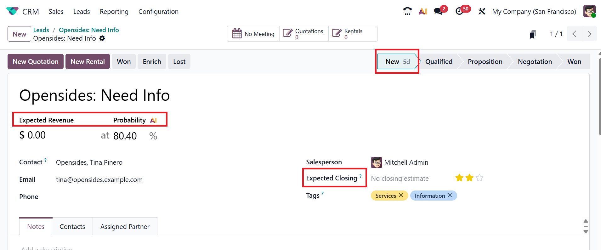 Under the Expected Revenue field, you can mention the expected company revenue for future purposes. Under the Probability field, the success rate of the opportunity is computed using AI, expressed as a percentage. Set the expected closing date for the opportunity by selecting it in the Expected Closing field. In each stage, you can view how long the lead remains in that particular stage.