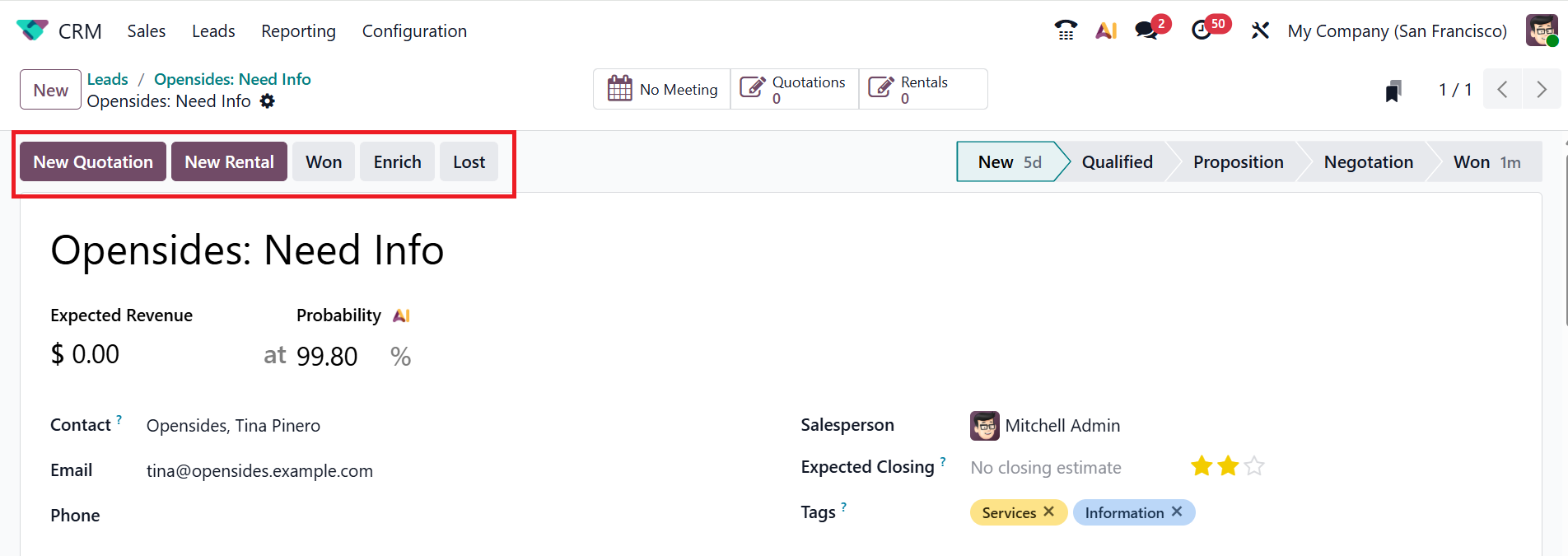 The screenshot below shows the opportunity to convert a sales quotation. Here, you can see five options: New Quotation, New Rental, Won, Enrich, and Lost.