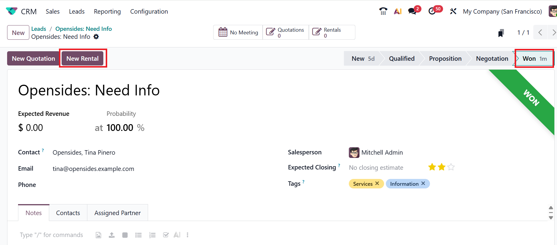 If the user clicks the Won button, the Opportunity will be directly changed to the Won stage. A Won ribbon will be added, as shown in the screenshot below. Click the New Rental button to create a new rental quotation.
