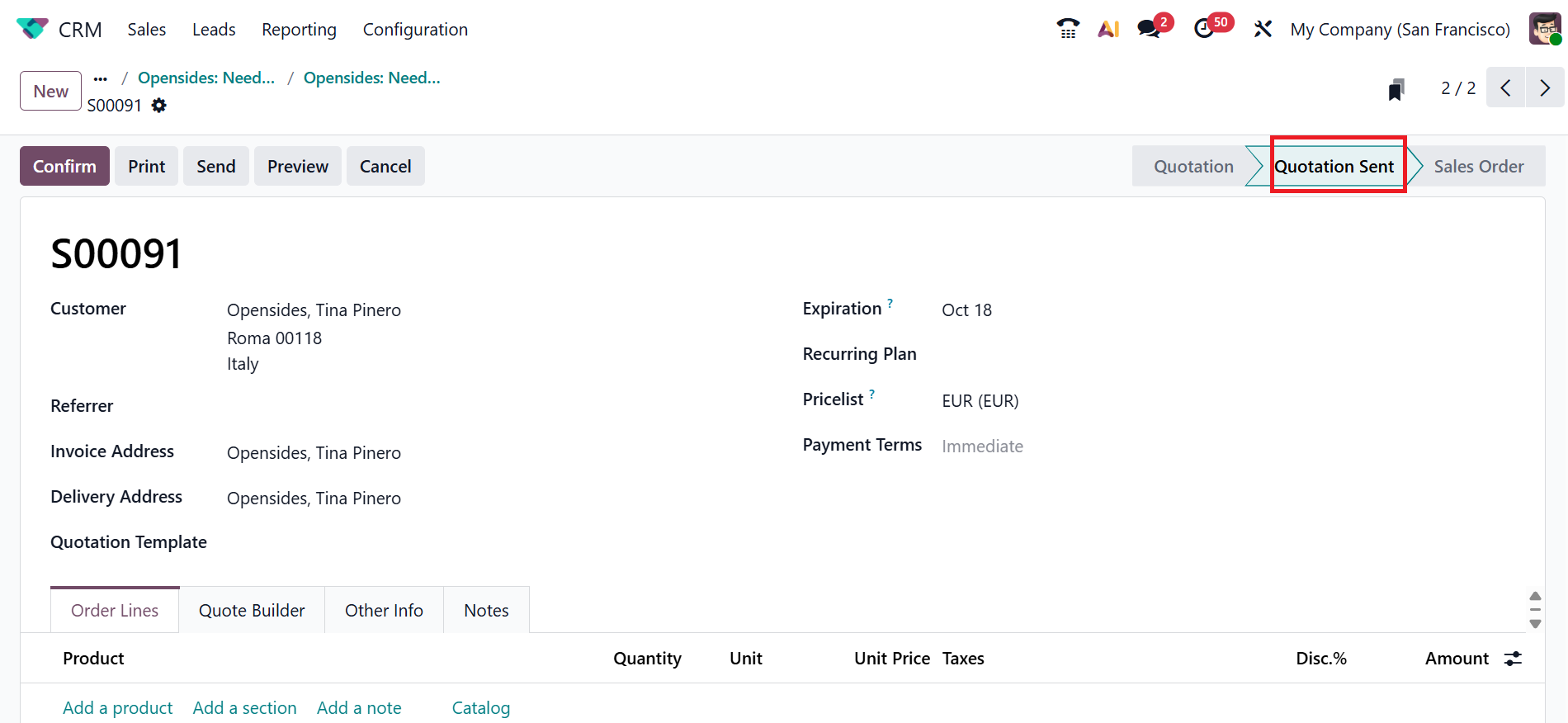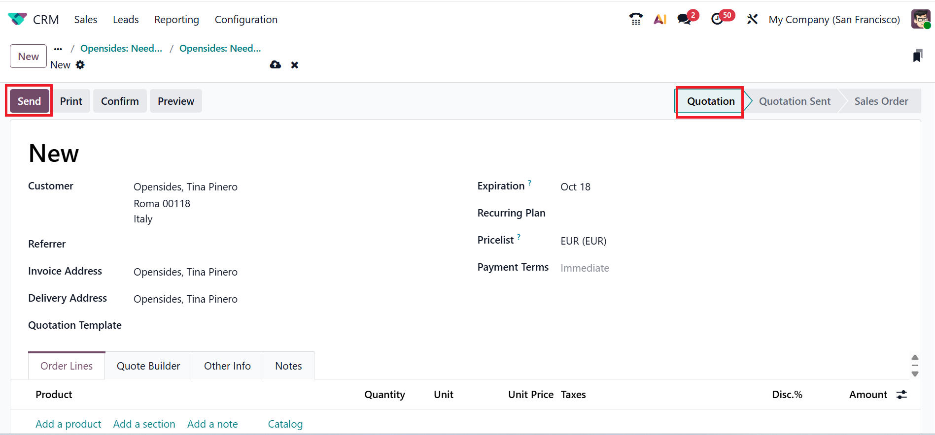 Click the New Quotation button to create a sales quotation from an opportunity. Based on the details from the chance, the quotation details will be filled automatically. You can add more information about the quotation in the tabs, such as Order Lines, Quote Builder, Other Info, and Notes. Next, click the Send button to forward the quotation to the customer via email.