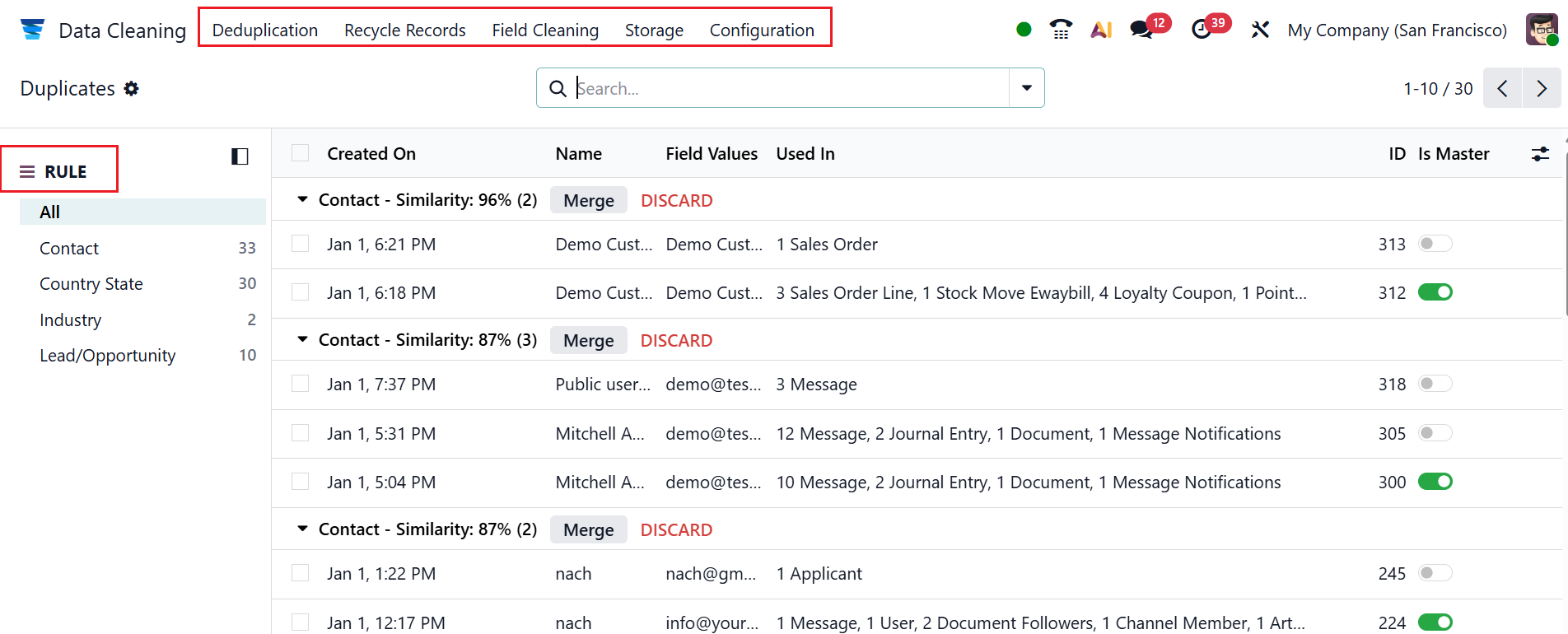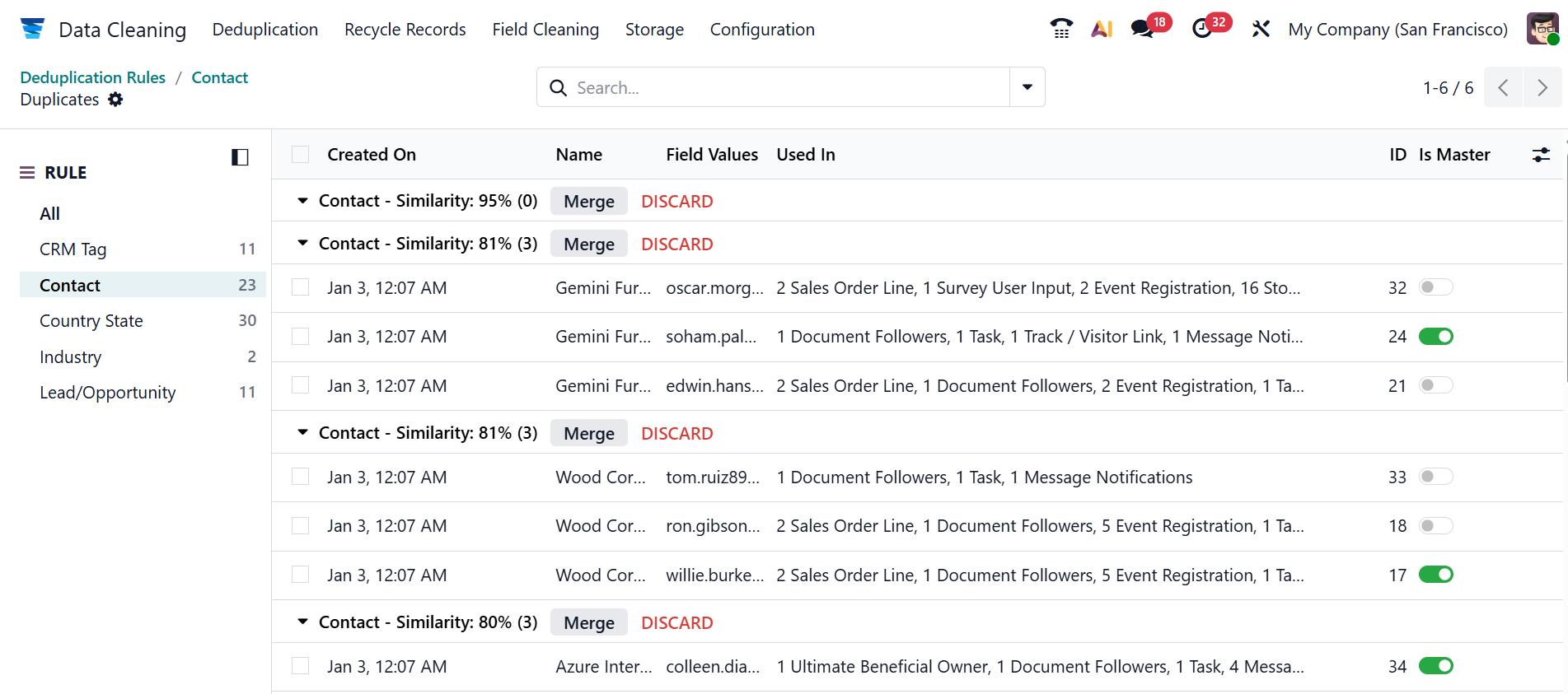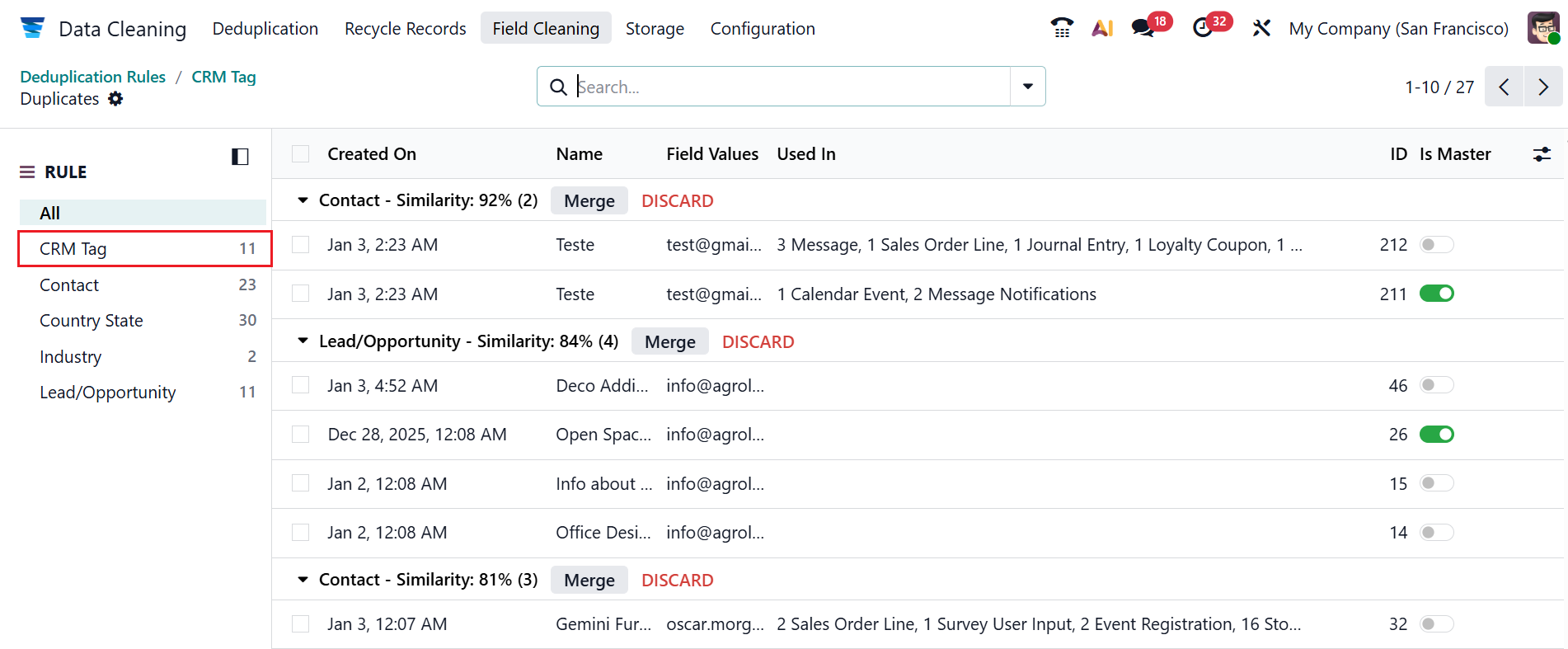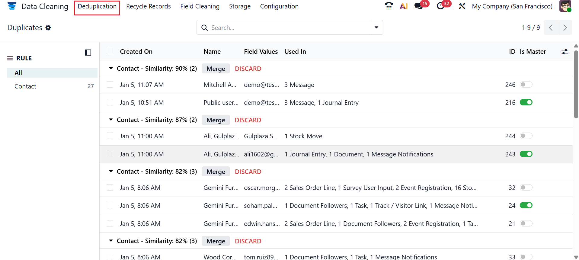 Under the Deduplication menu, you can view all the duplicate records with details such as Created On, Name, Field Values, Used In, ID, and Is Master.