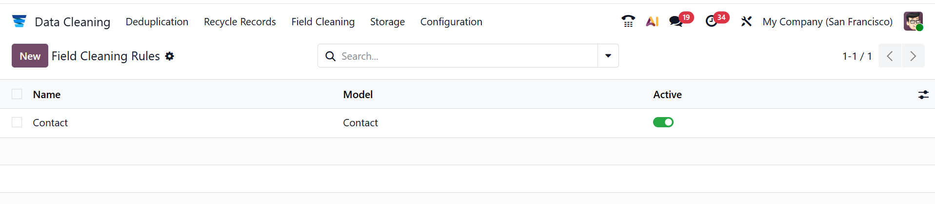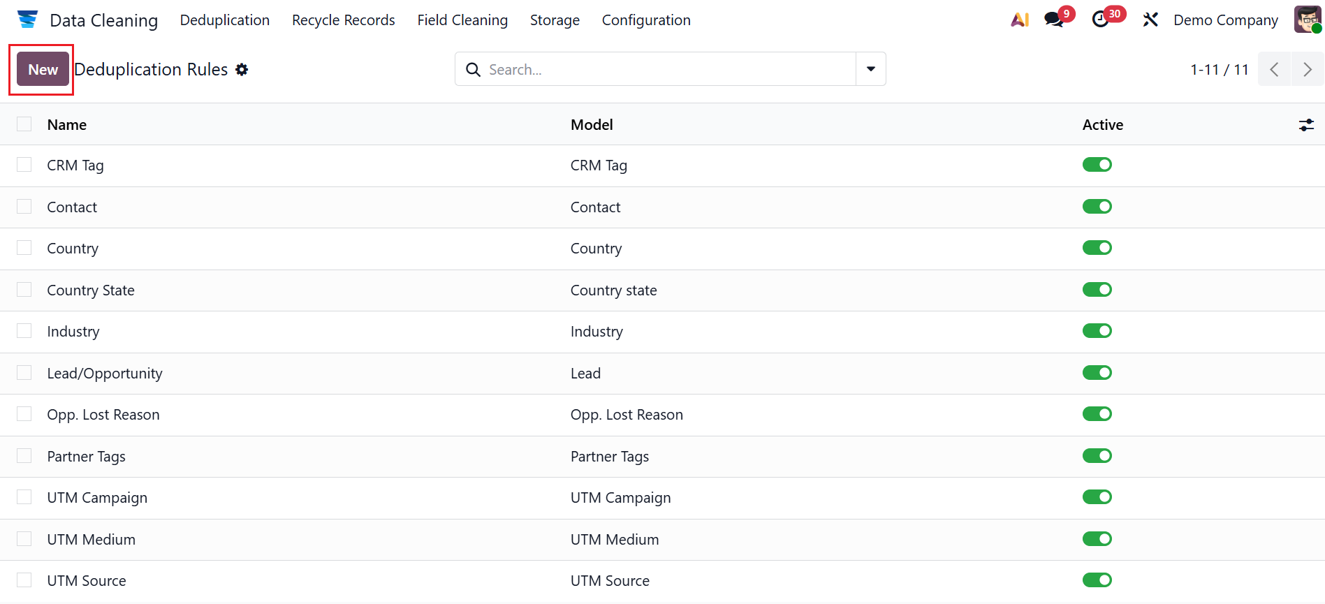 The Deduplication rule defines the conditions for detecting duplicate records. It automatically identifies and merges duplicates, ensuring clean, accurate, and consistent data across the system. Here, you can see a list of deduplication rules, including the details such as Name, Model, and Active. To create a new deduplication rule, click on the New button.