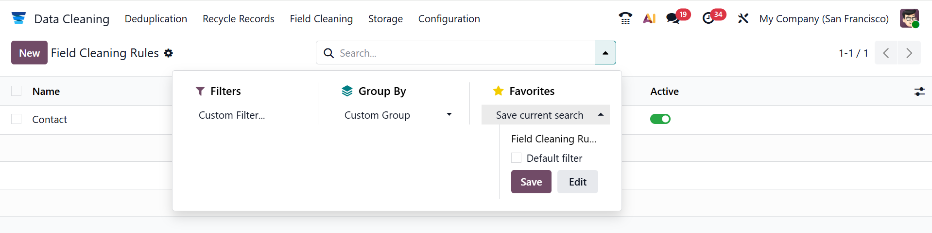 In the Data Cleaning module, you can see three rules: Deduplication, Recycle Record, and Field Cleaning.
