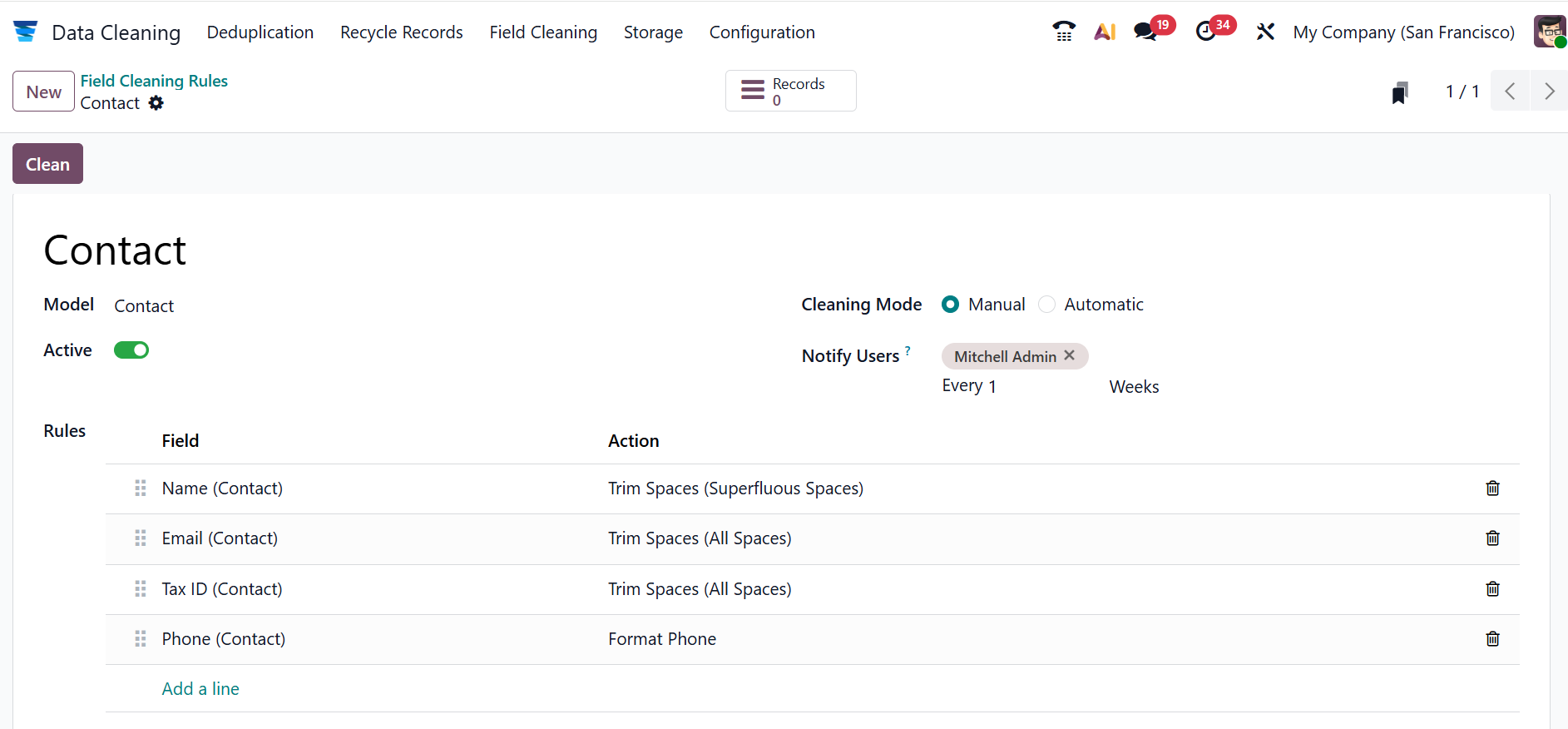 Here, you can add a rule name and select a Model from the list. To activate the rule, you can enable the Active field. In the Cleaning Mode field, select either Manual or Automatic. When Manual is selected as the Cleaning Mode, add users to the Notify Users field to notify them of new records to clean.