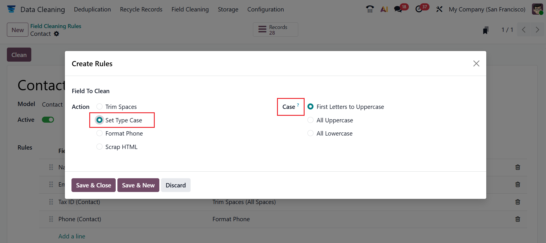 You can also select the Action as either Format phone or Scrap HTML. The Format Phone helps to convert phone numbers into a clean format. The Scrap HTML removes HTML tags from a field value. Then, click on the Save & Close button. To clean the records, click on the Clean button.
