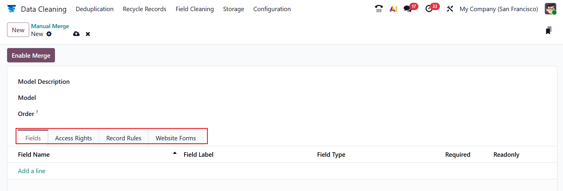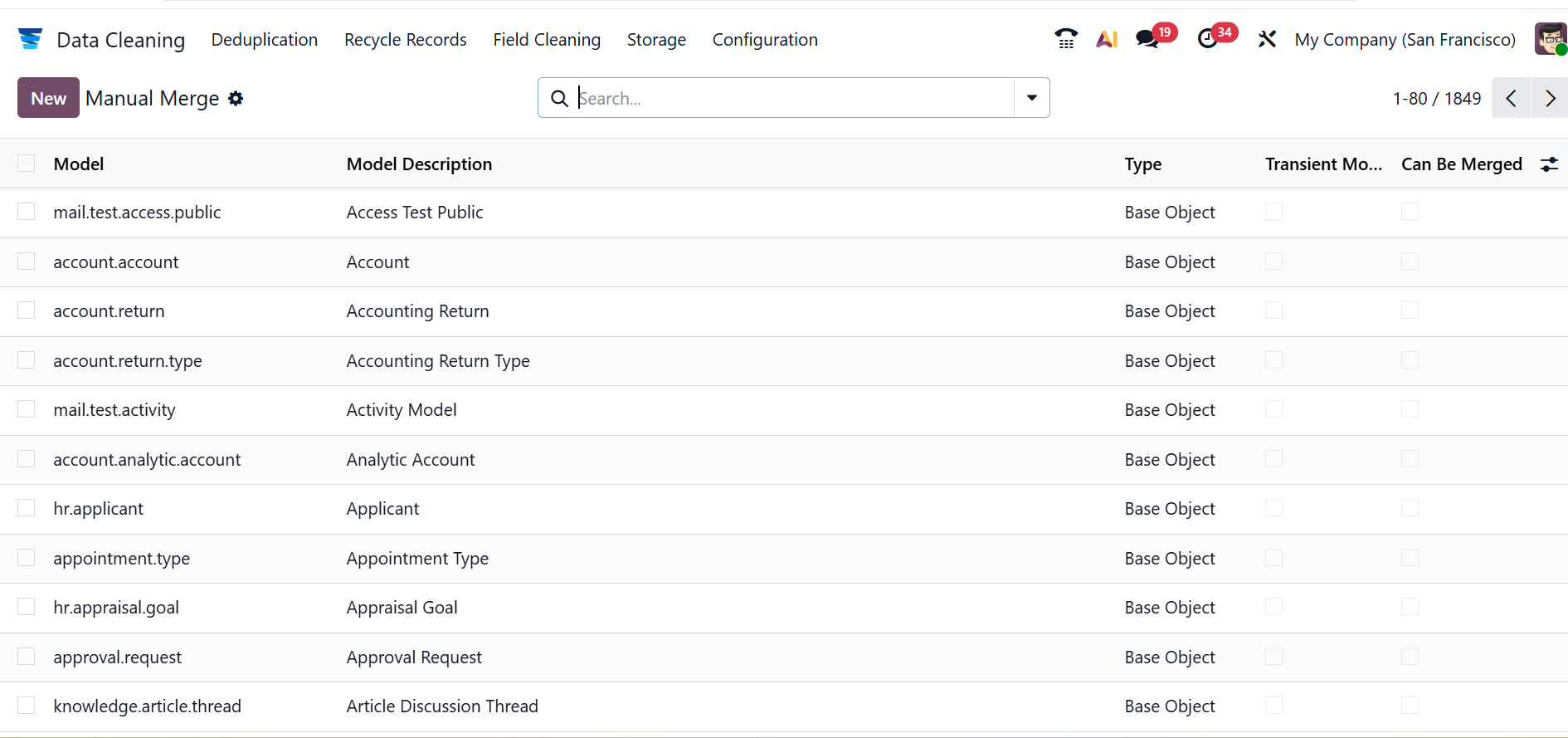In Odoo 19, Manual Merge allows users to manually combine duplicate records by choosing which data to keep in the final record. Here, you can see the details of the manual merge, such as Model, Model Description, Type, Transient Model, and Can Be Merged. Click the New button to create a new record.