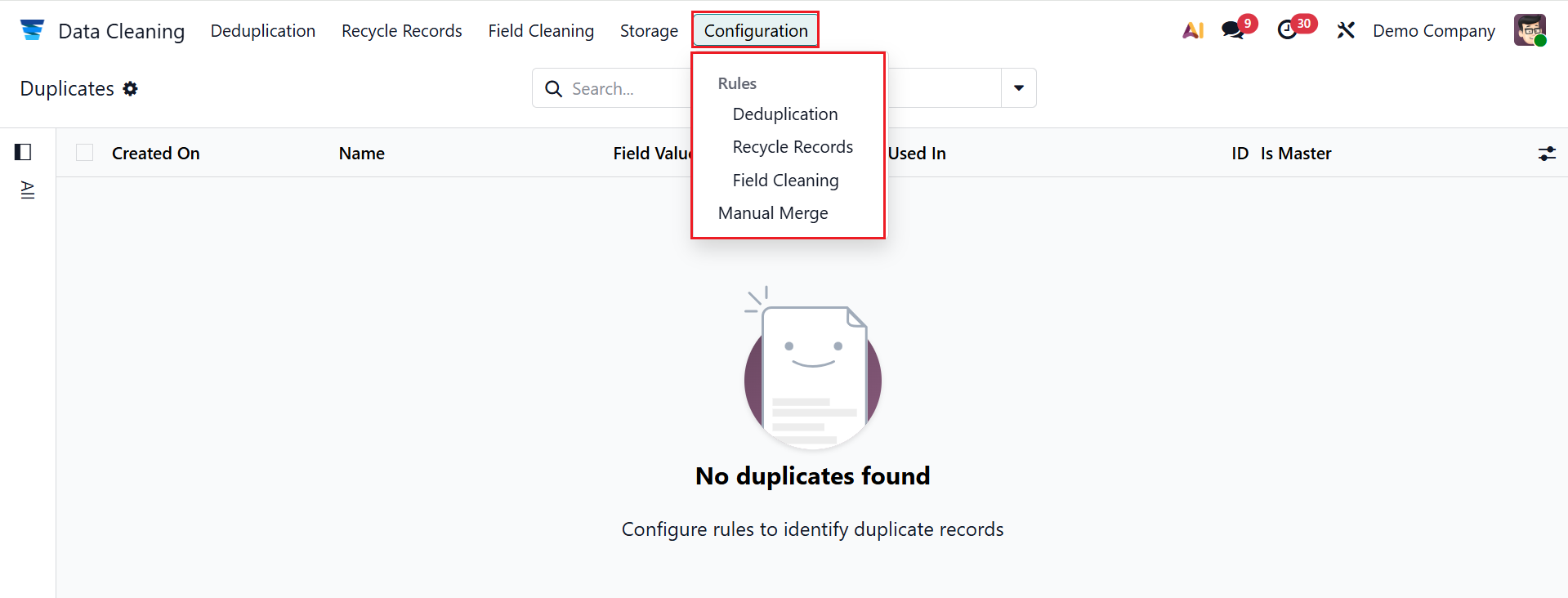 Under the Configuration menu, you can see the options such as Deduplication, Recycle Records, Field Cleaning, and Manual Merge.