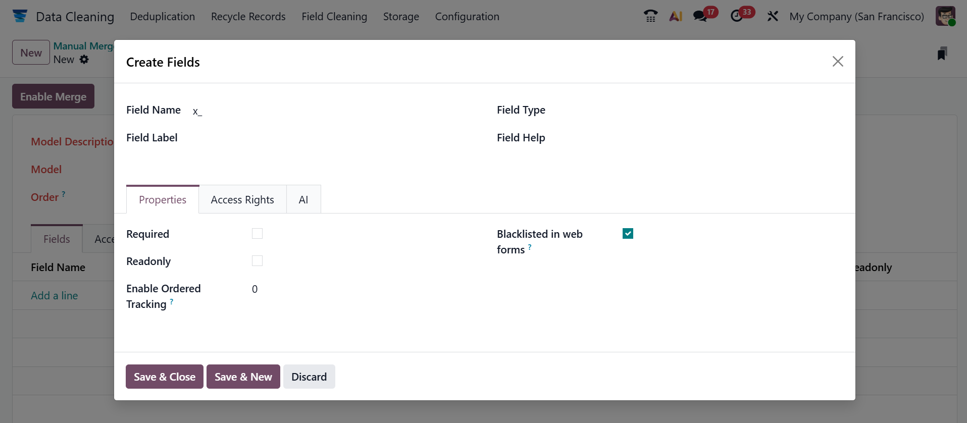 Under the Fields tab, click on the Add a line button under the Field Name field. The following pop-up screen will appear. To create a new field, add Field Name, Field Label, Field Type, and Field Help. Here, you can see three tabs: Properties, Access Rights, and AI. Under the Properties field, enable the Required and Readonly fields. In the Enable Ordered Tracking field, you can add order tracking values. Enable the Blacklisted in web forms field to blacklist this field.