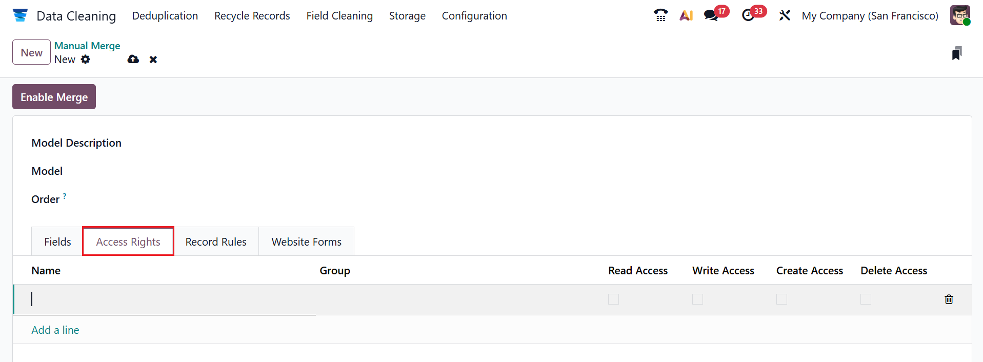 Under the Access Rights field, click on the Add a line button to add Name and Group for the model. You can also enable the options such as Read Access, Write Access, Create Access, and Delete Access.
