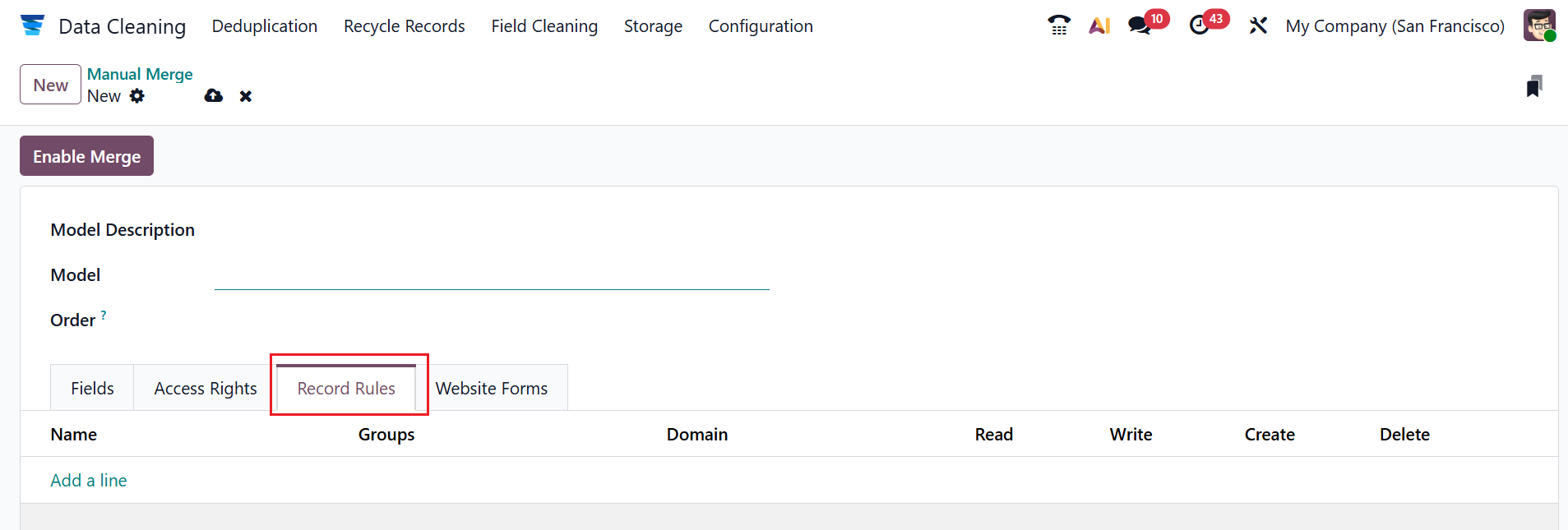Under the Record Rules tab, click on the Add a line button to add Name, Group, and Domain for the model. You can enable additional options, including Read, Write, Create, and Delete.