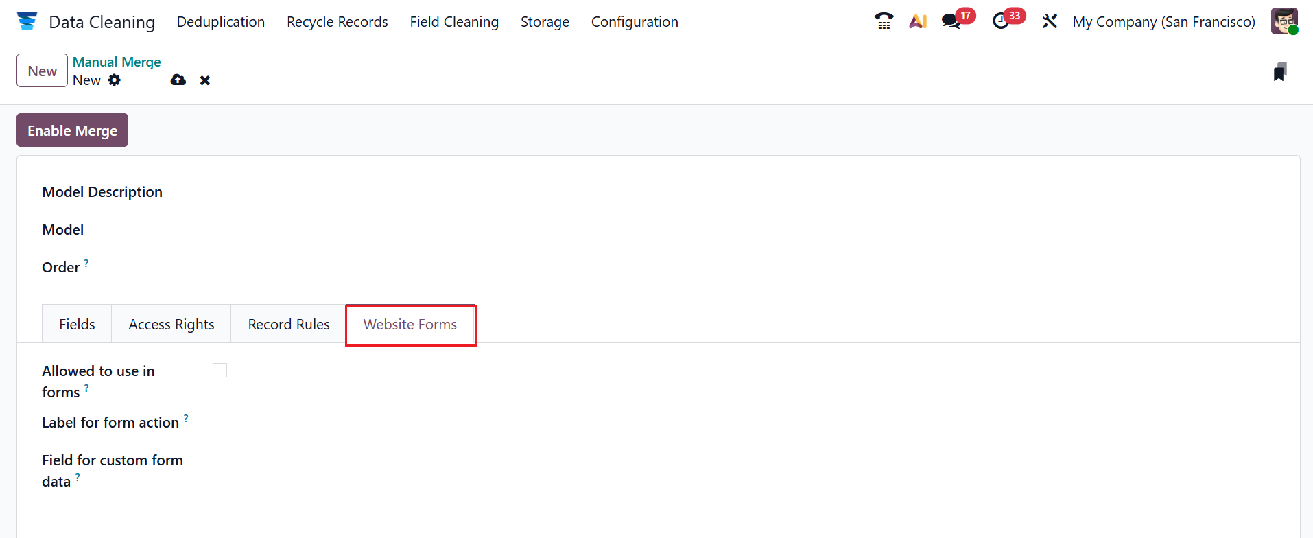 Under the Website Forms tab, enable the Allowed to use in forms field to enable the form builder feature. In the Label for form action field, you can add text displayed on the submit button of a website form. In the Field for custom form data field, you can specify the field where Odoo stores additional information submitted through the website form that does not correspond to standard model fields.