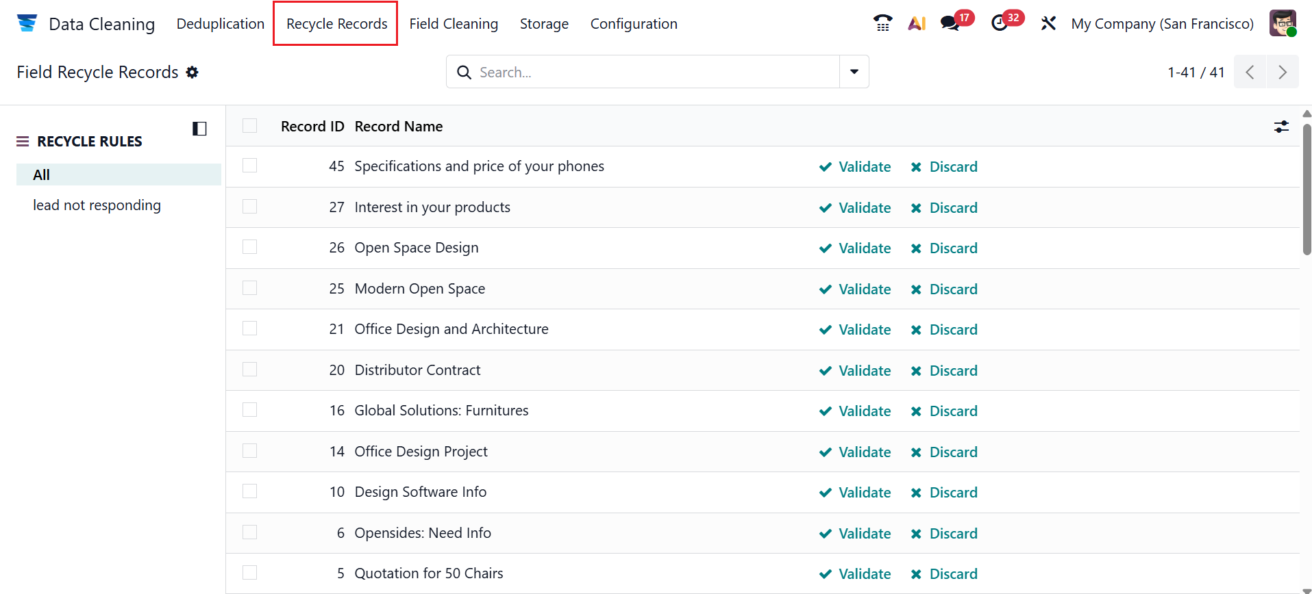 Under the Recycle Records menu, you can view all the recycled records. Here, you can either validate or discard the records.