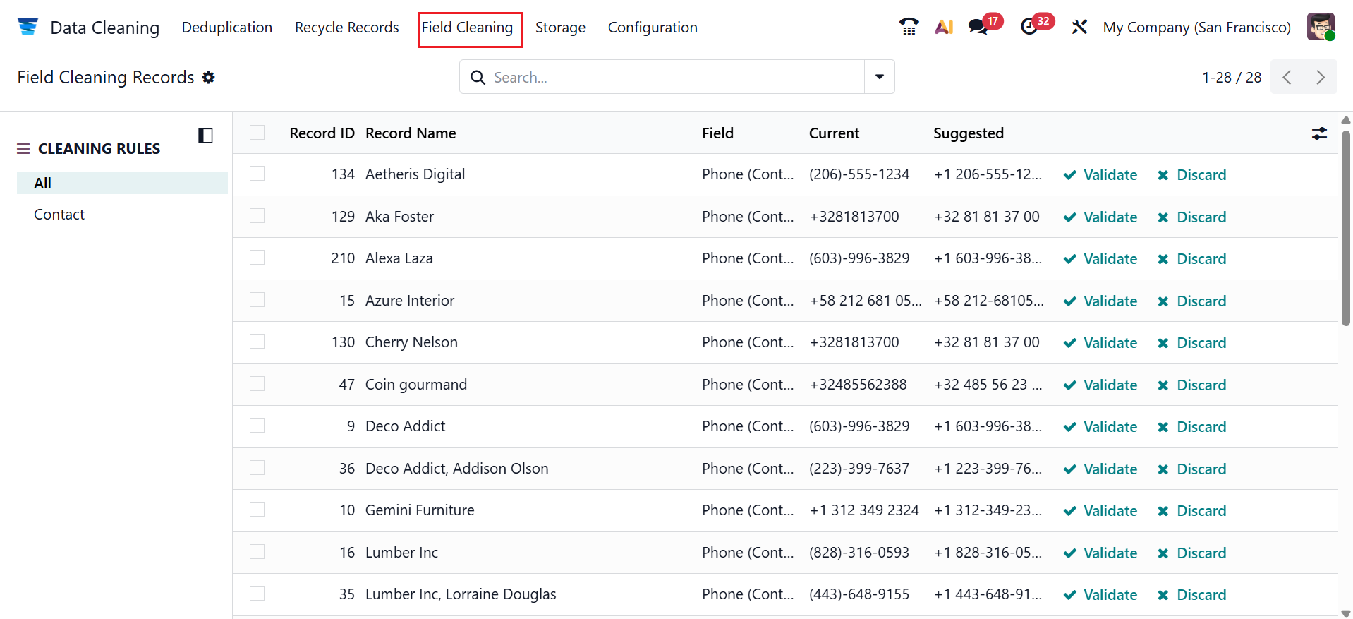 Under the Field Cleaning menu, you can view all the cleaning records with details such as Record ID, Record Name, Field, Current, or Suggested.