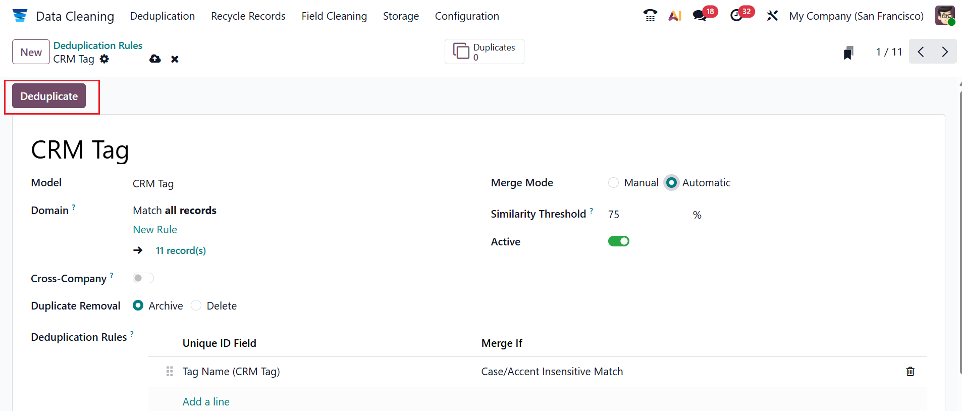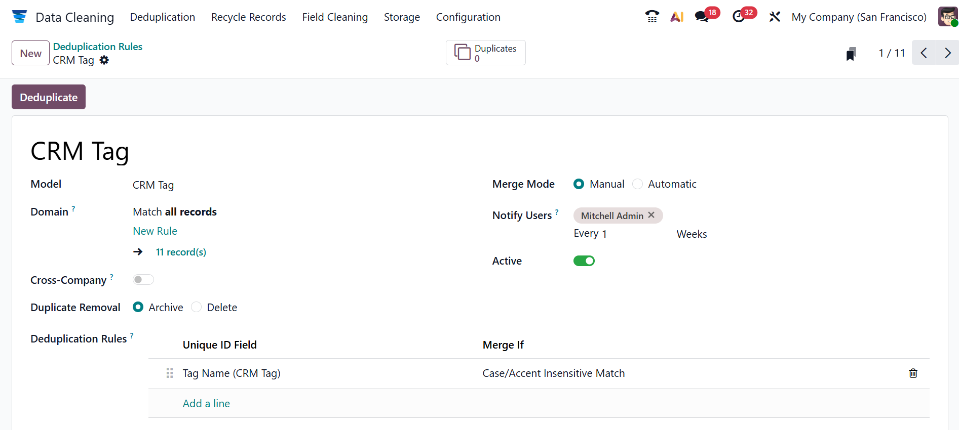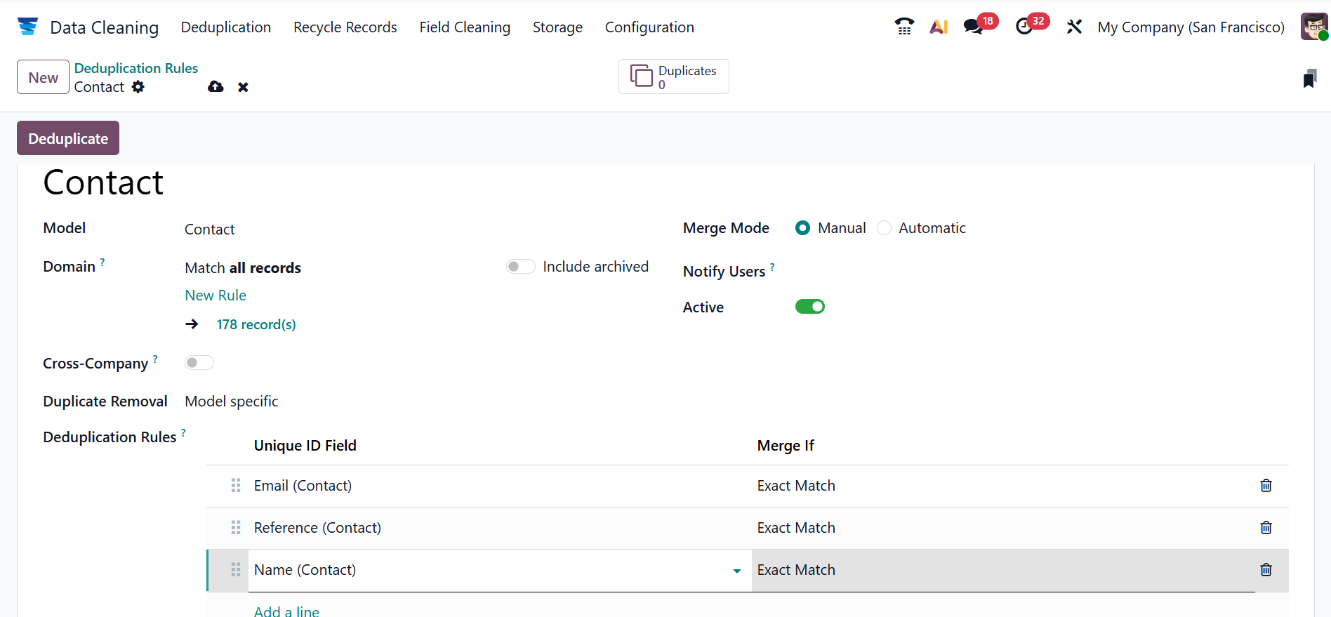 Firstly, add a name for the new rule or select an existing one. You can select a Model for the rule from the list. In the Domain field, you can specify the number of records eligible for the rule. Enable the Cross-Company field to suggest duplicates across different companies. In the Duplicate Removal field, select either Archive or Delete option based on the selected Model. In the Merge Mode field, select either Manual (manually merges duplicate groupings) or Automatic (automatically merges duplicate groupings). You can see a Notify Users field when using the Manual Merge model. Enter a list of users in this box to be notified when new entries need to be merged. Enable the Active field to start capturing duplicates. In the Deduplication Rules field, click the Add a line button under the Unique ID Field column to select a field from the drop-down menu. Select Exact Match or Case Accent Insensitive Match in the Merge If field.
