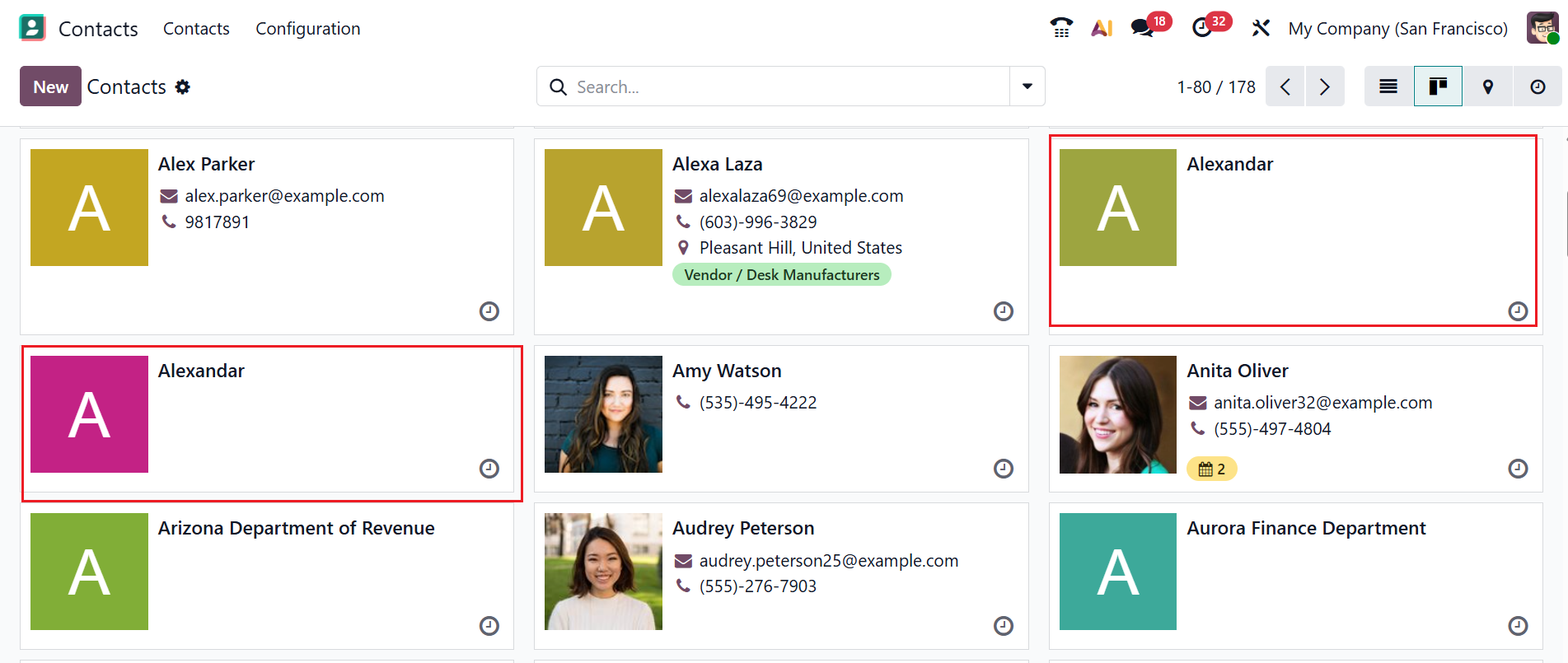 Let’s check the Deduplication Rules by combining two contacts. For that, create two contacts with the same name in the Odoo 19 Contacts module. Create two contacts named “Alexandar”, as shown in the screenshot.