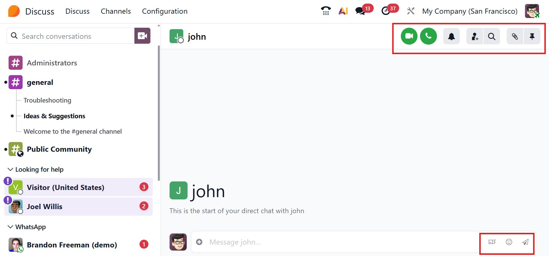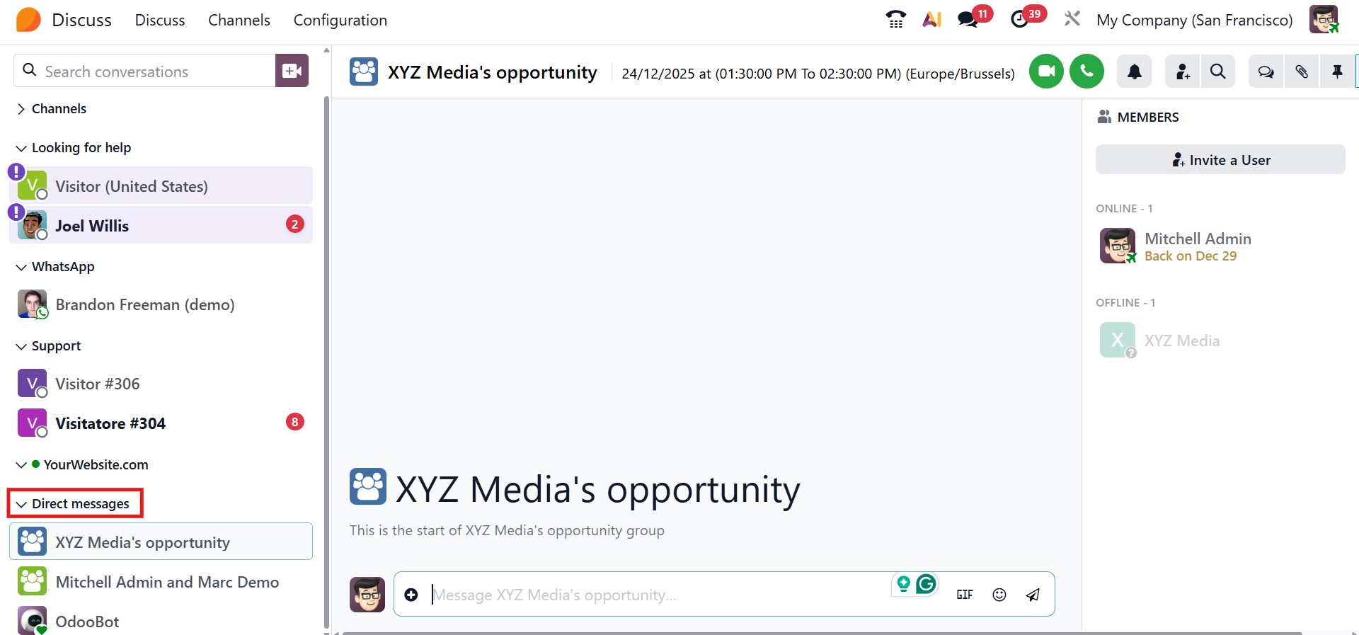 Direct messaging includes a variety of interactive tools that make conversations more engaging. Users can send emojis, GIFs, files, voice notes, and initiate video calls directly from the chat. When a URL is shared, Odoo automatically displays a preview of the link content, allowing users to understand the context without leaving the conversation. Video calls also support background blur, helping participants maintain a professional and distraction-free appearance during meetings.
