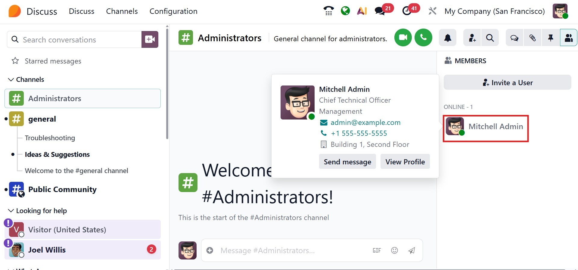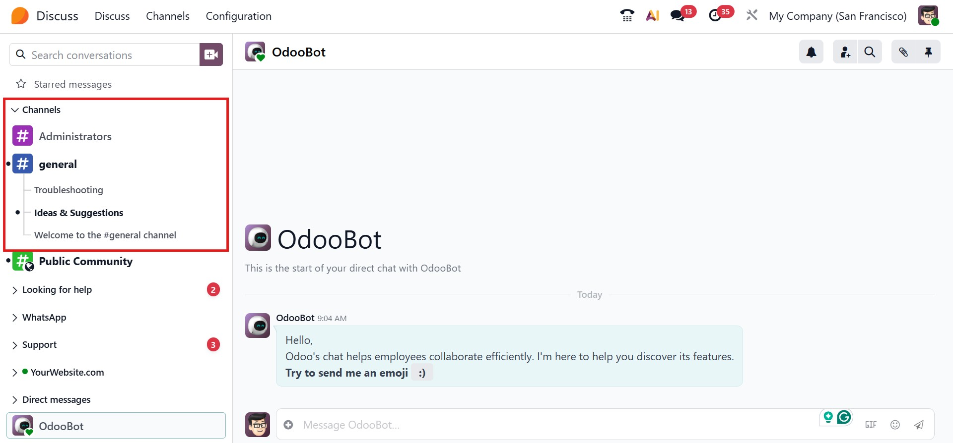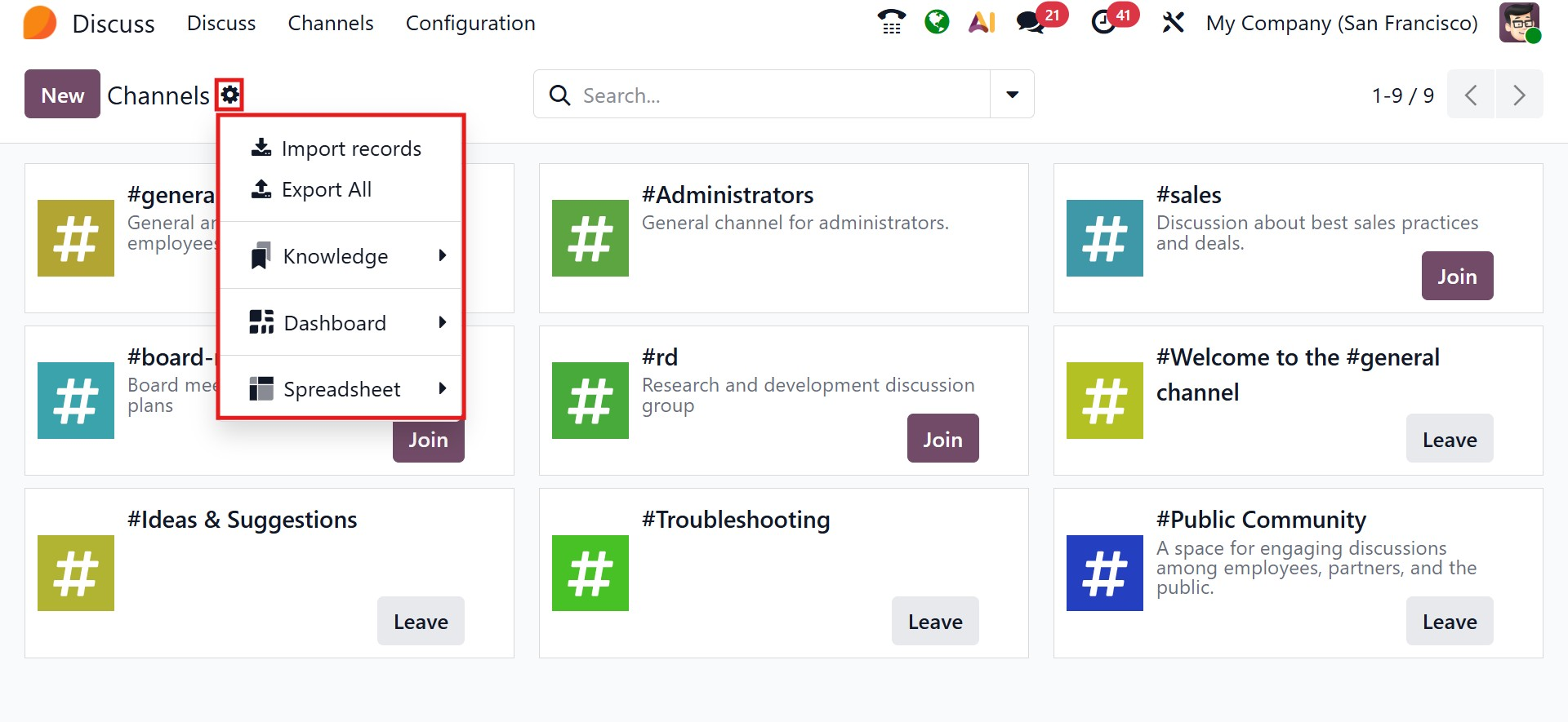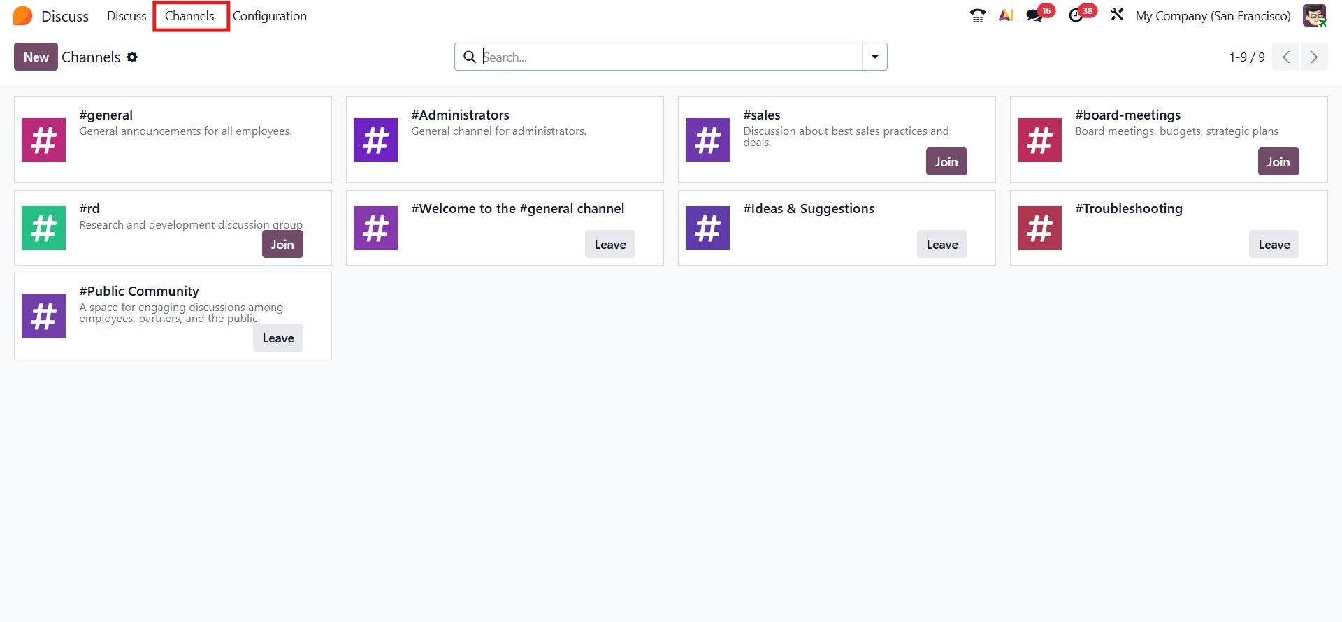 Odoo 19 provides a Channels management view, accessible from the top menu, Channels. From here, users can browse available channels and choose to join or leave them as needed. Visual indicators and unread message counters help users quickly identify active or pending discussions.