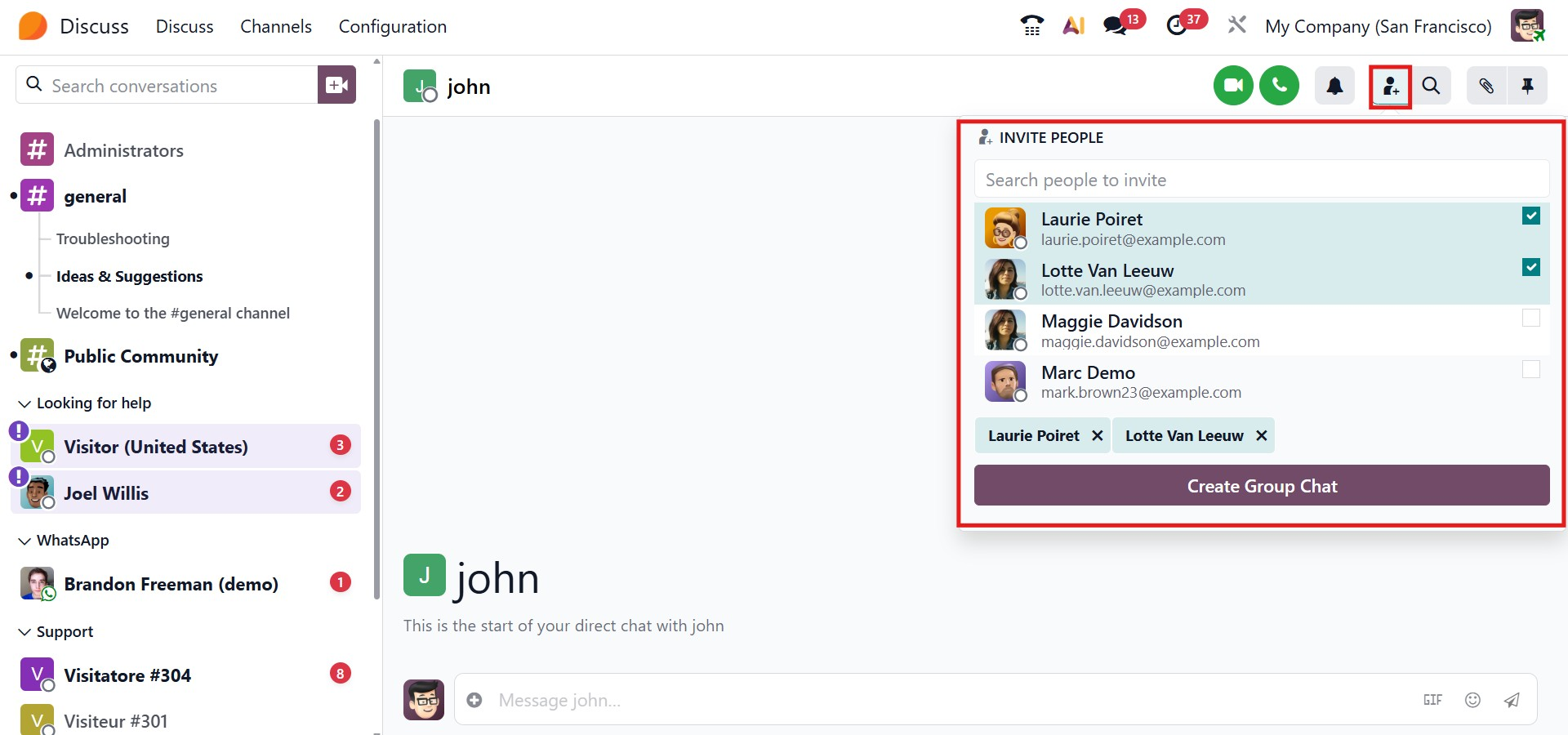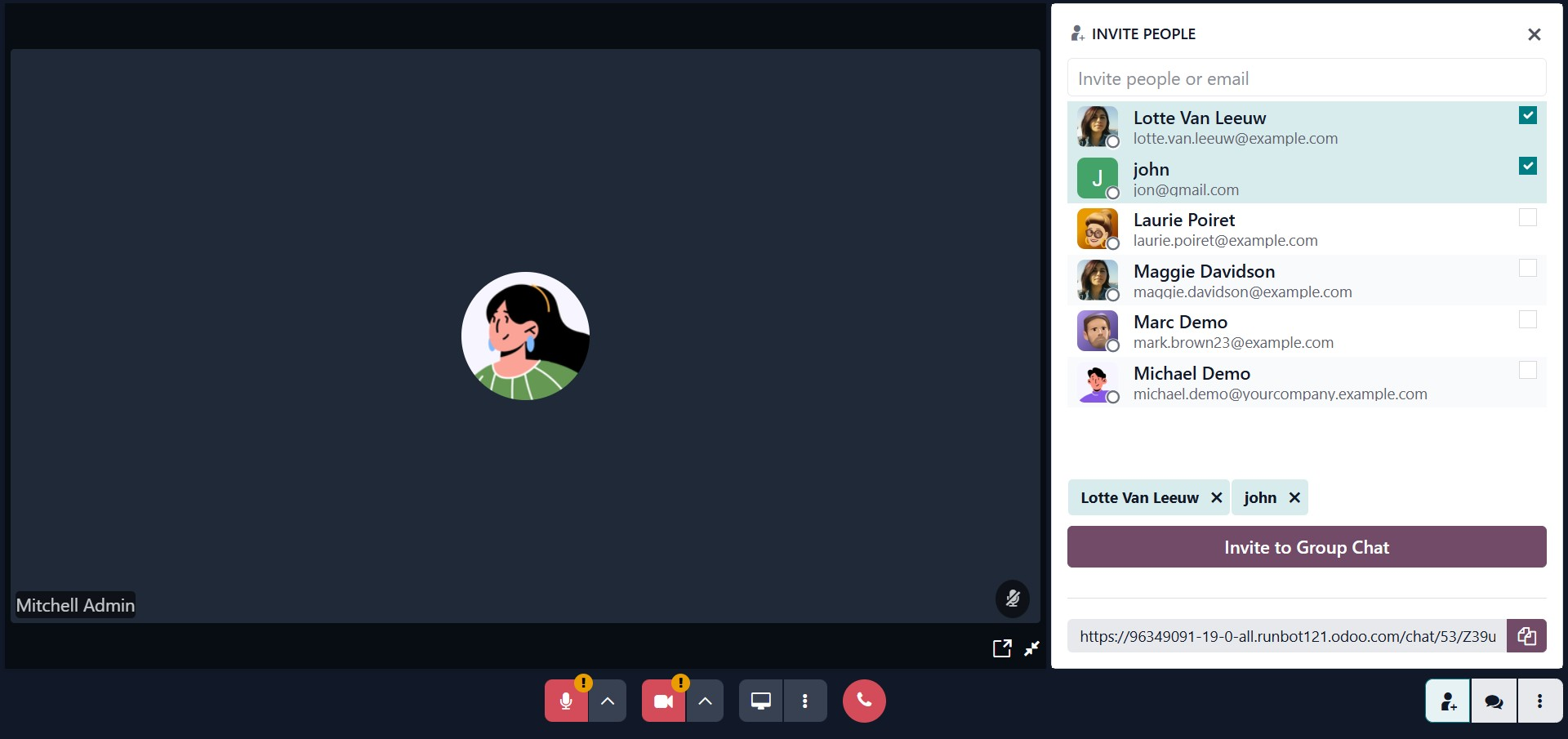 For group discussions, users can create chat rooms by inviting multiple participants. This is done by clicking Invite People, selecting users from the list, and confirming with Create Group Chat. Odoo also generates shareable channel links that can be copied and sent via direct messages or email, making it easy to include additional team members in relevant discussions.