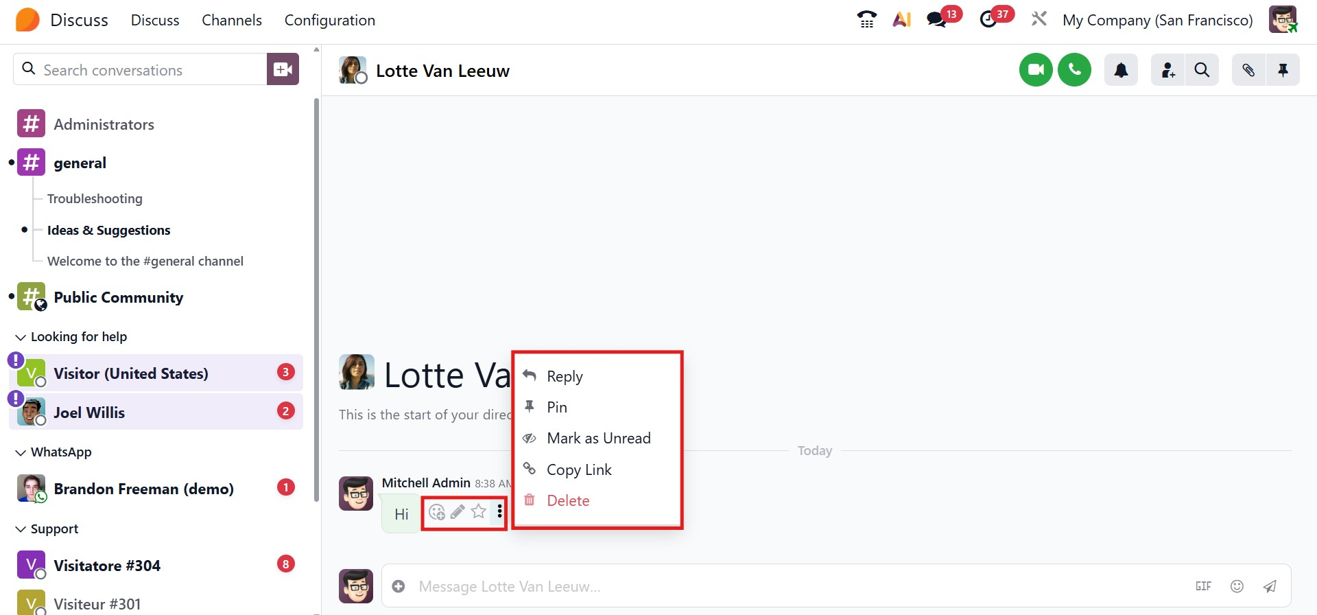 When hovering over a message in a direct chat, Odoo displays a contextual menu with several useful actions: