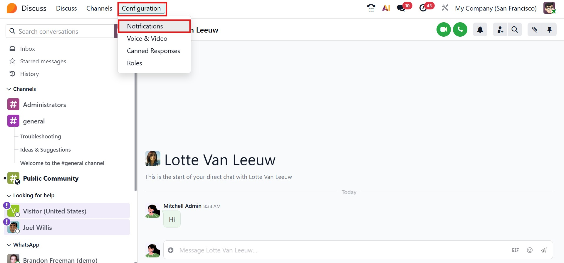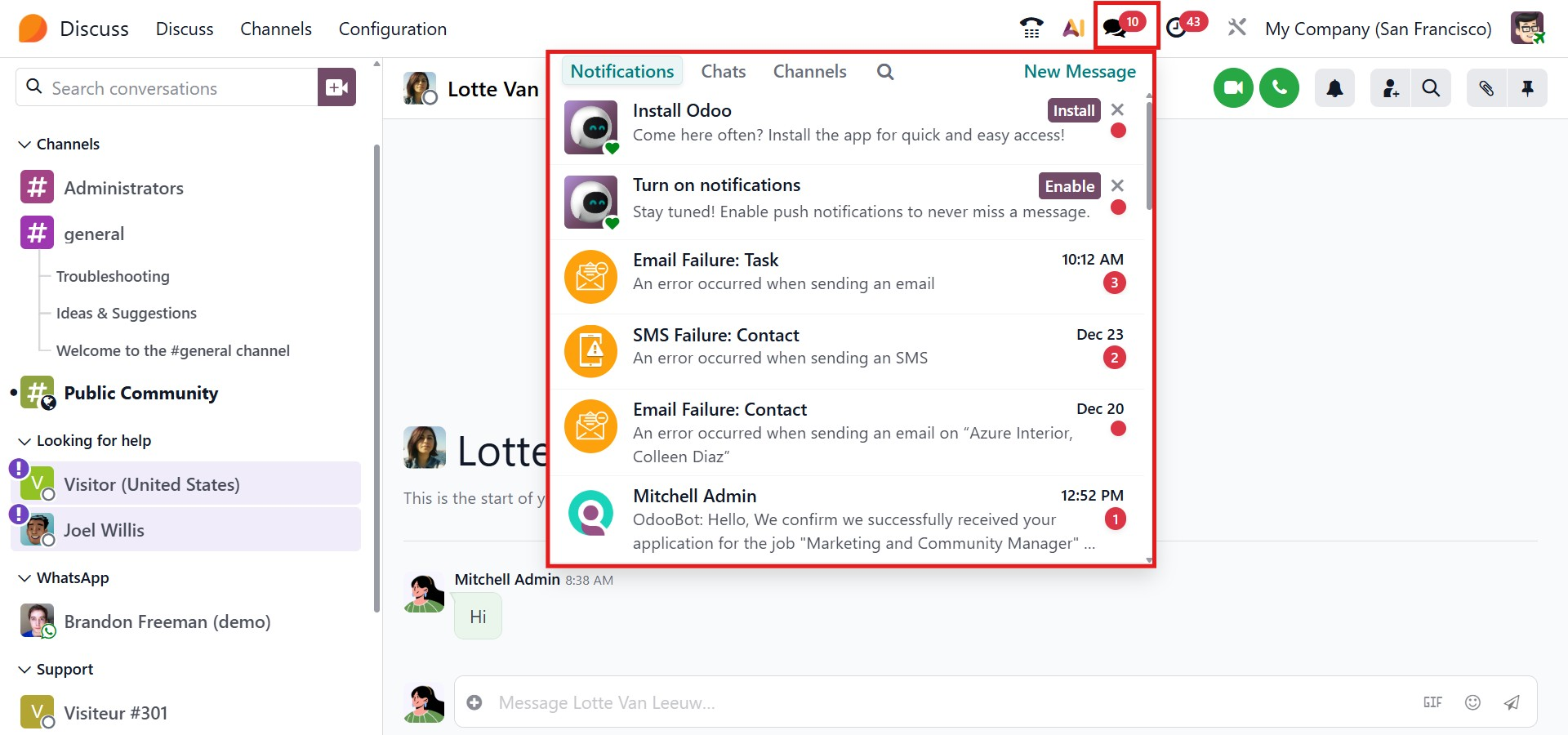 The Discuss module also supports desktop notifications, ensuring users receive real-time alerts for new messages. These can be enabled through the Notification icon, where users can customize alert preferences based on their needs. This feature helps users stay informed even when working in other parts of Odoo.