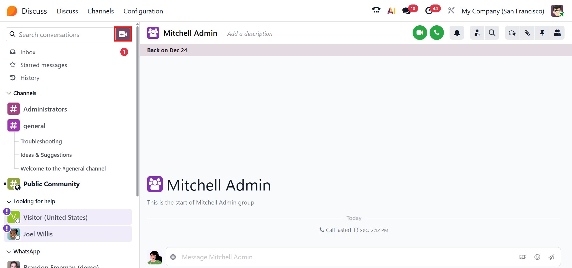 This visual status system improves internal communication by providing quick insights into team availability, enabling more efficient and timely interactions within the Discuss module.