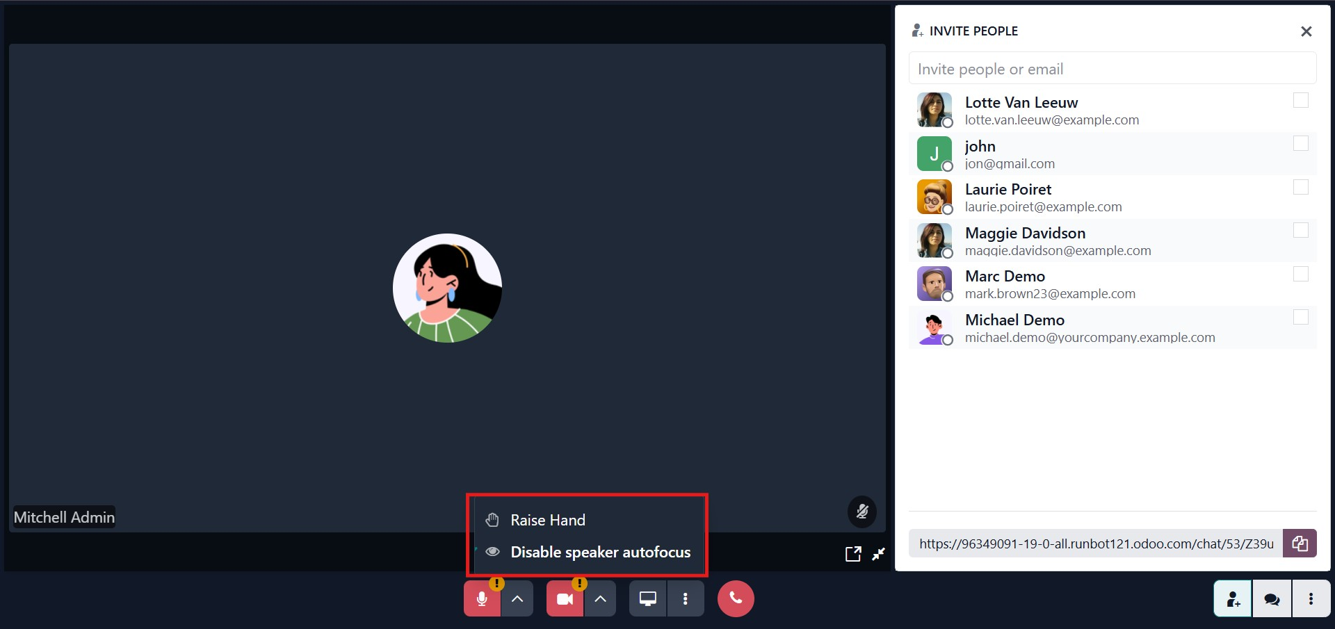 Odoo 19 provides a variety of meeting controls, including: