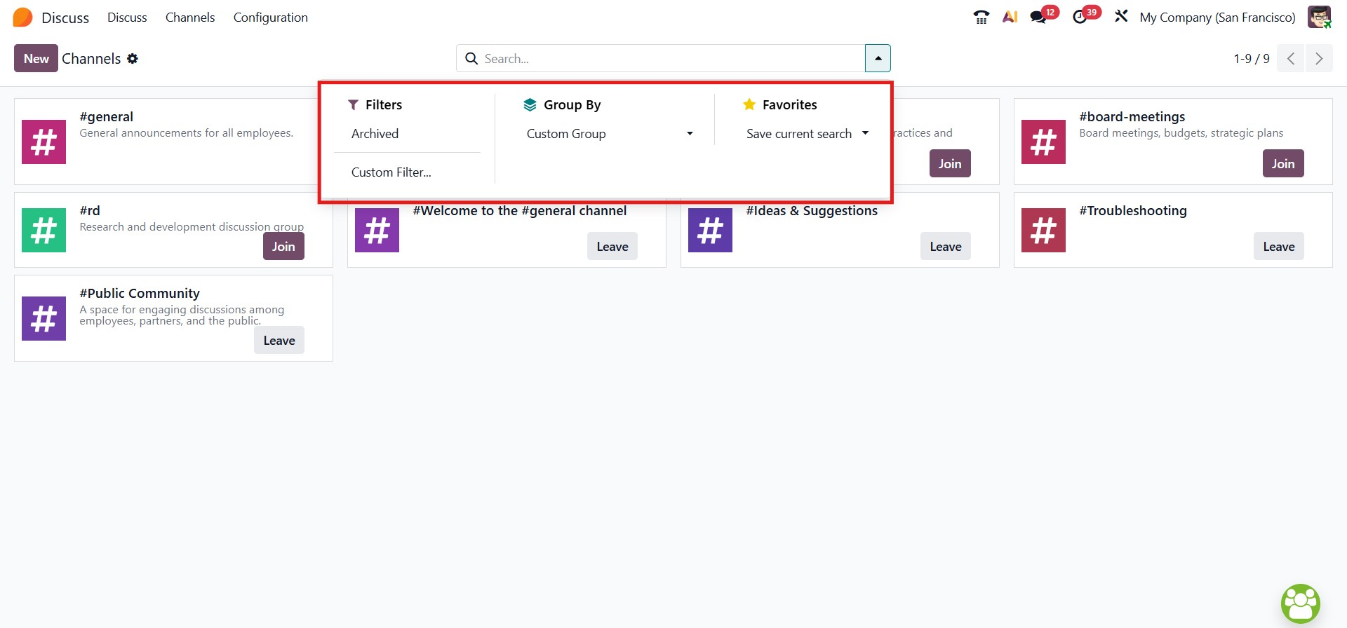 To streamline navigation and enhance organization, the Discuss module includes ‘Filters’ and ‘Group By’ options in the advanced search bar. These features help users narrow down the list of channels based on criteria relevant to their workflow. Furthermore, frequently used channels can be saved under the ‘Favourites’ section for quicker access.