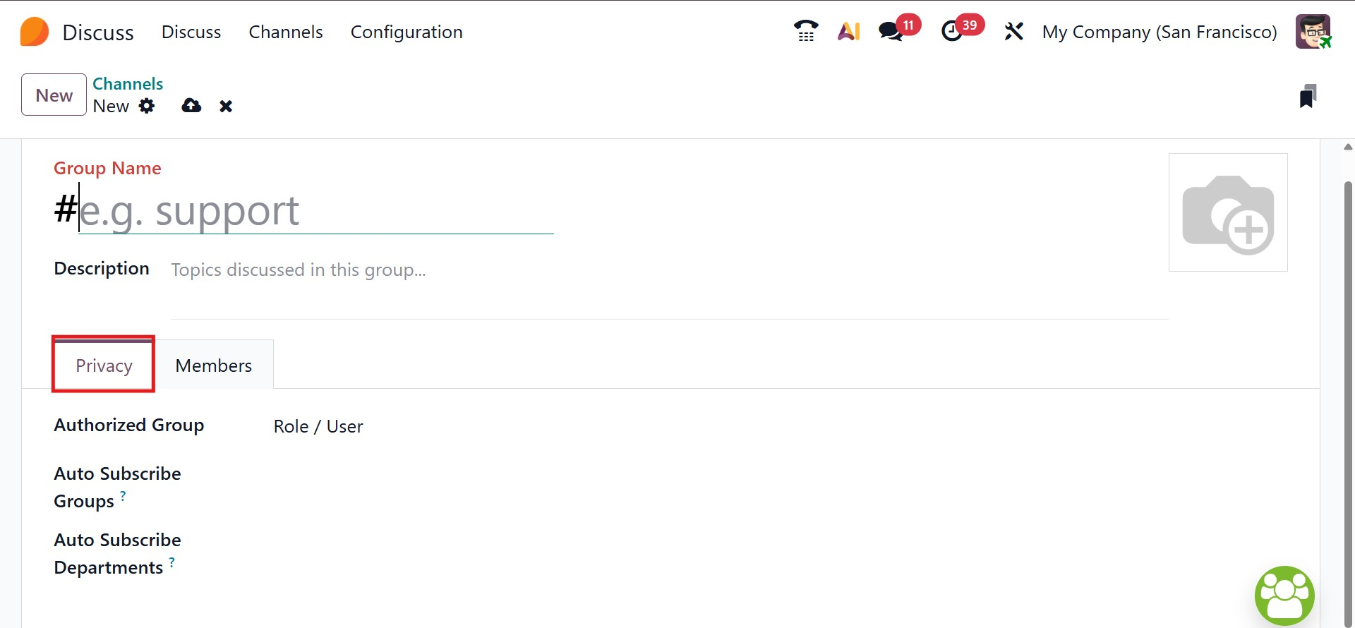 Under the Privacy tab, administrators can define rules like Auto Subscribe Departments, Authorized Subscribe Groups, and Authorized Groups. These controls help enforce proper access by automatically adding specified users to the group and regulating visibility based on roles or departmental membership.