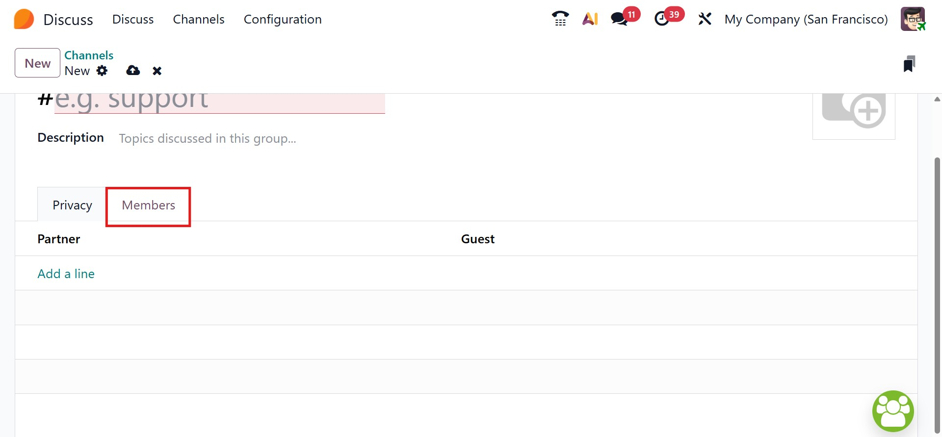 Within the Members section, specific users can be added manually by selecting the ‘Add a line’ option, allowing precise control over who participates in the discussion. Once all settings are configured and saved, the channel becomes immediately available for collaboration, enabling focused and efficient group communication across the organization.